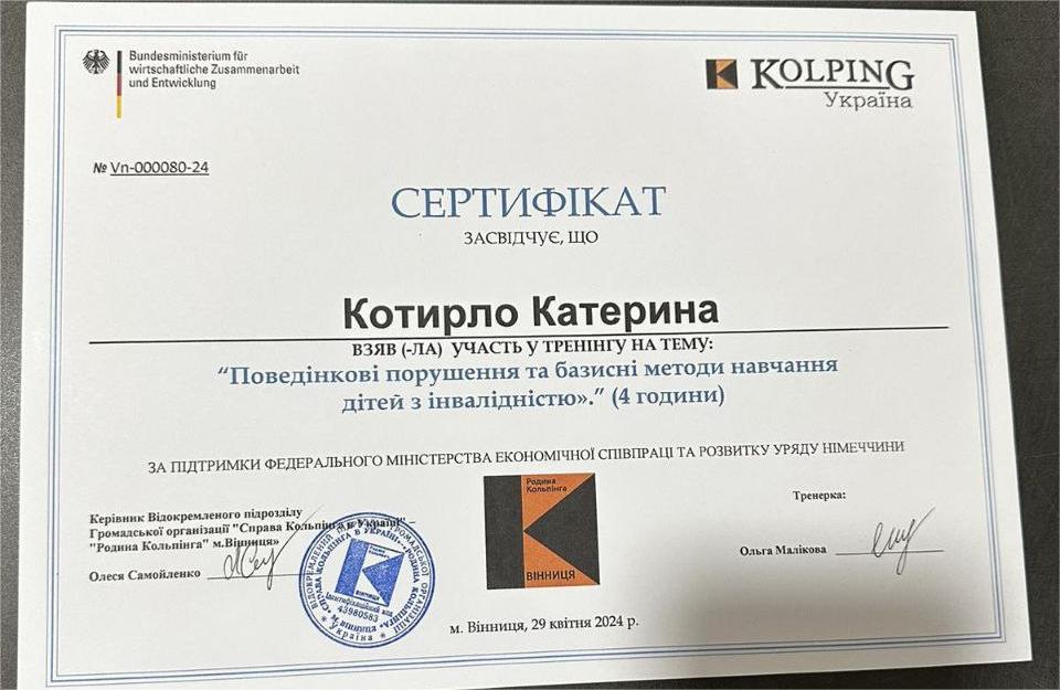 2024 — Тренінг «Поведінкові порушення та базисні методи навчання дітей з інвалідністю», Kolping Україна.