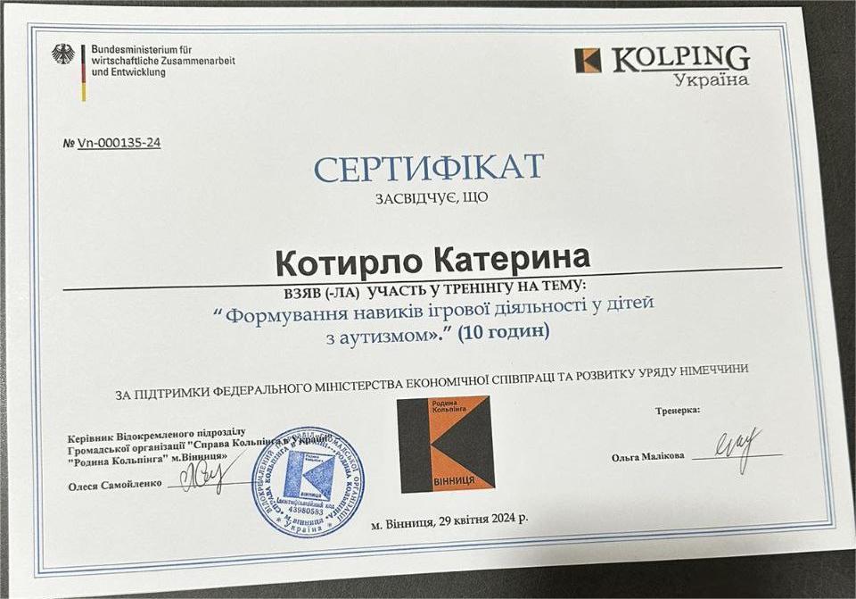 2024 — Тренінг «Формування навичок ігрової діяльності у дітей з аутизмом», Kolping Україна