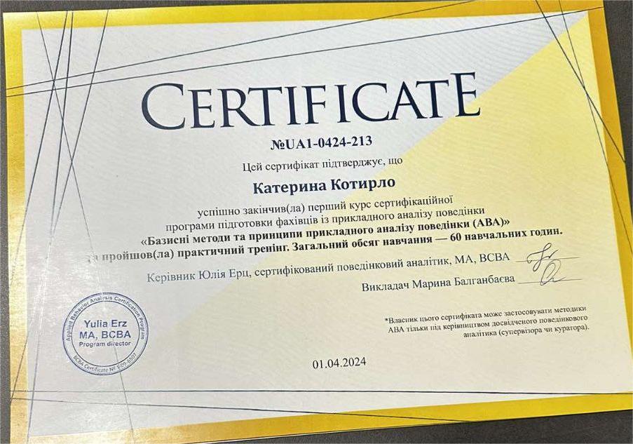 2024 — Курс «Базисні методи та принципи прикладного аналізу поведінки (ABA)»,Керівник Юлія Ерц – сертифікований поведінковий аналітик, MA, BCBA