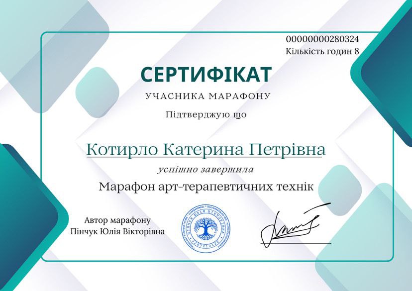 2024 — Базовий модуль «Терапія дитячої травми» АРТ-терапевтична асоціація (Оксана Деркач та ін.)