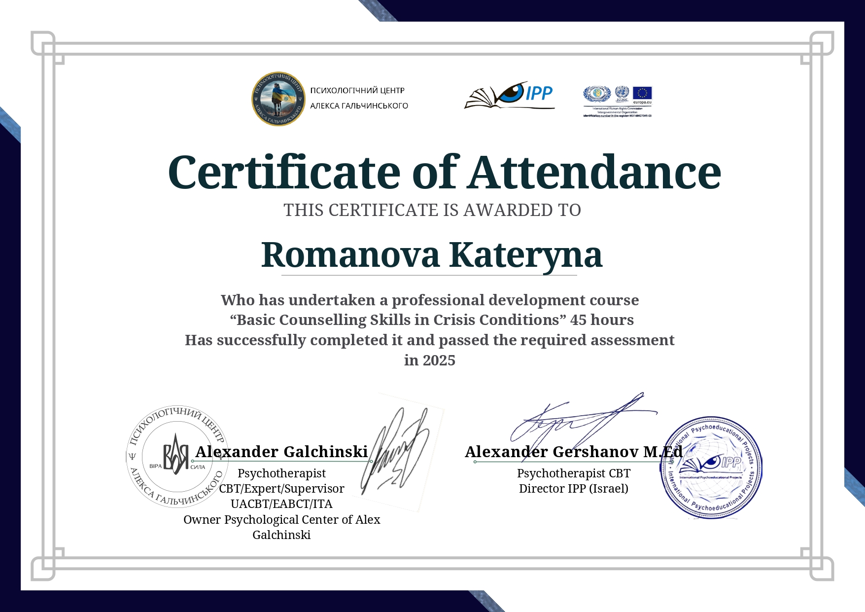 - Лекційно-практичний курс “Базові навички консультування в умовах кризи” (КПТ+, ACT, DBT), А. Гальчинський, А. Гершанов | 03.09.25-20.11.2025
