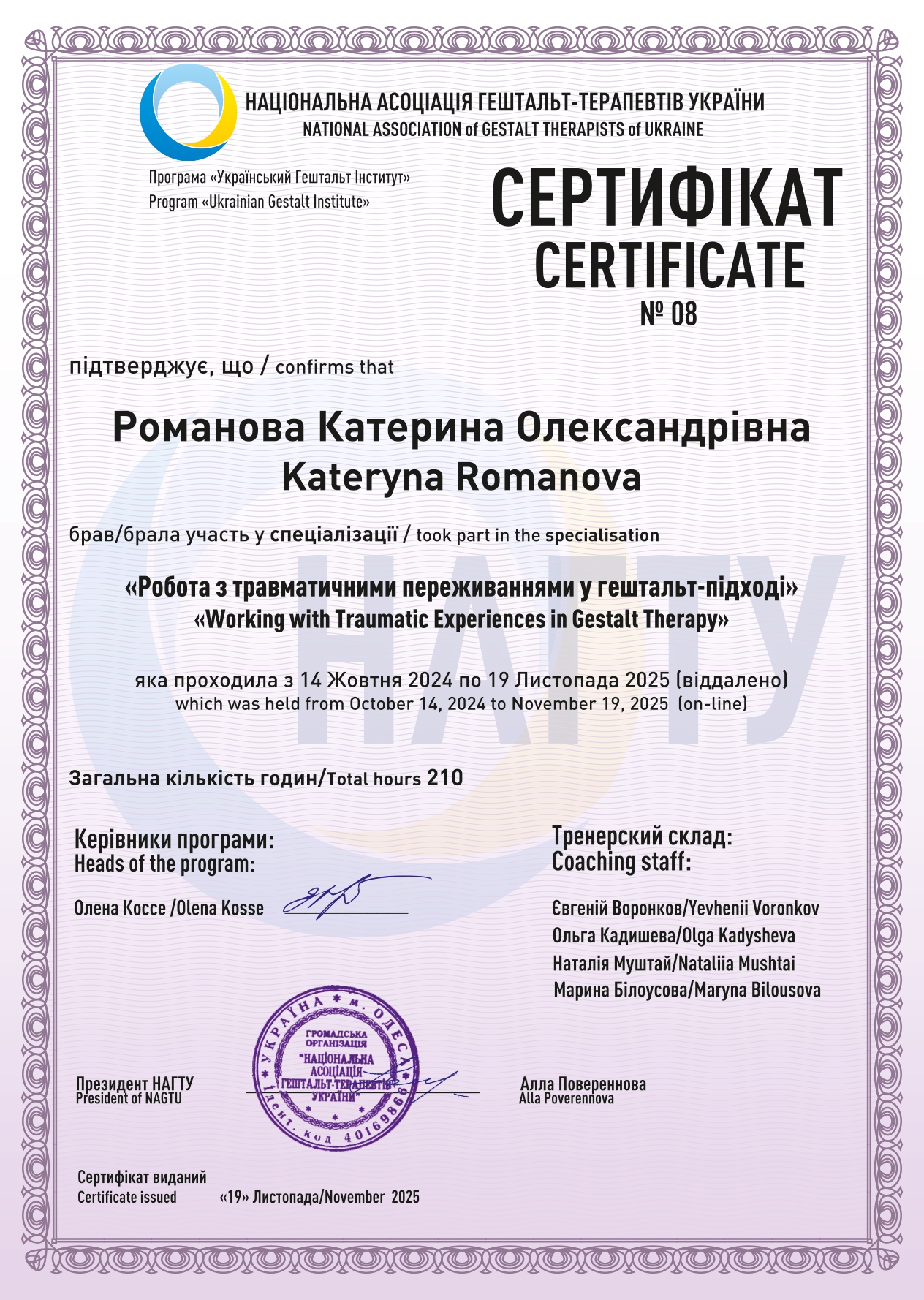 - Поглиблений курс “Робота з травматичними переживаннями”, НАГТУ, О. Коссе | 14.10.2024-19.11.2025, 210 годин