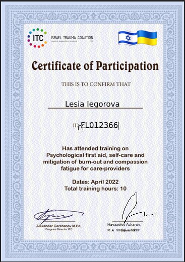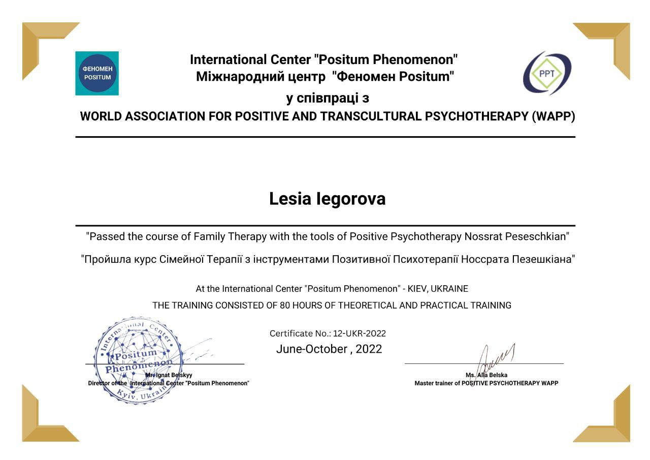 2022 — Курс сімейної терапії з інструментами Позитивної Психотерапії Носсрата Пезешкіана, International Center “Positum Phenomenon”, Київ
