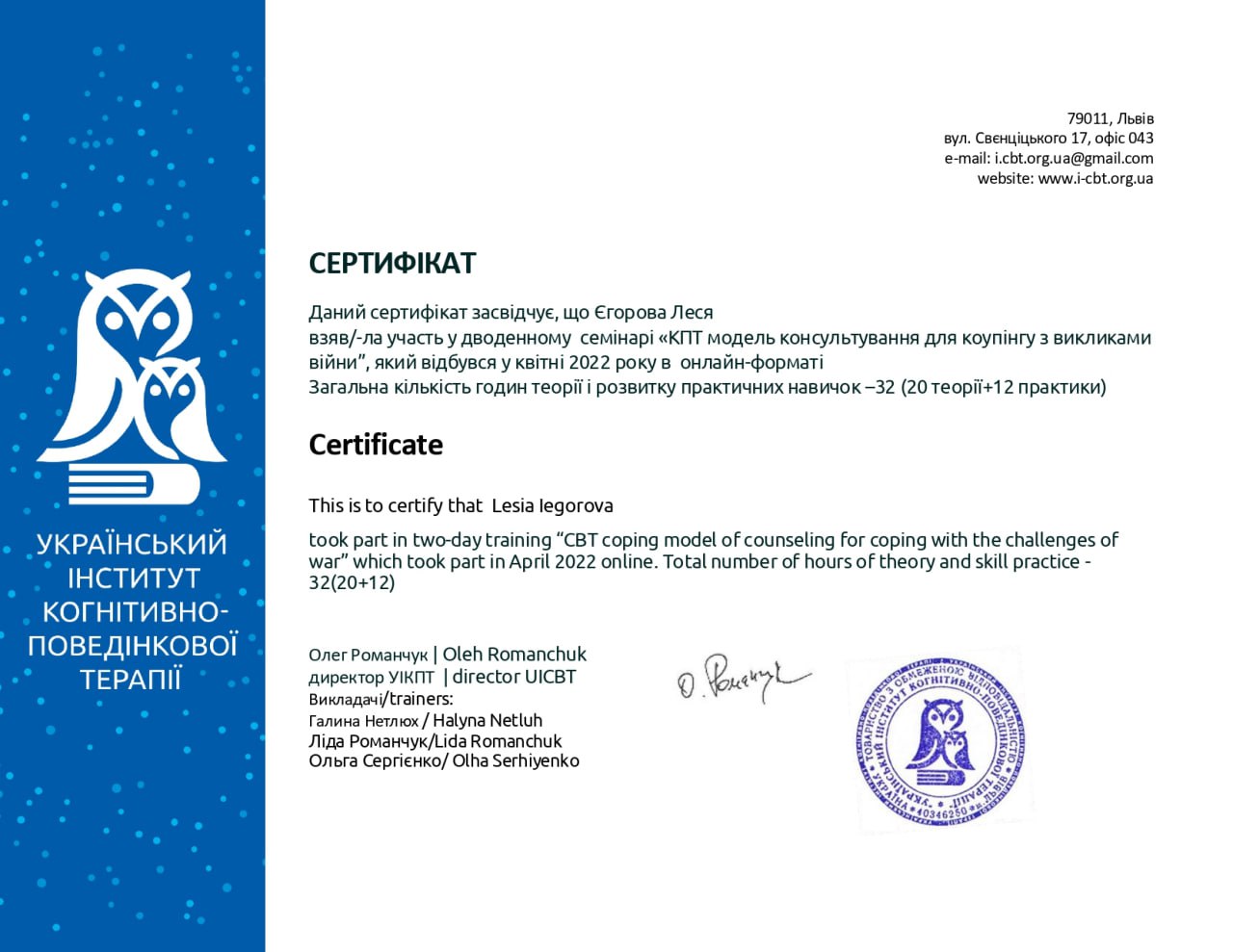 2022 — «Діти і війна: навчання технік зцілення», Український інститут когнітивно-поведінкової терапії