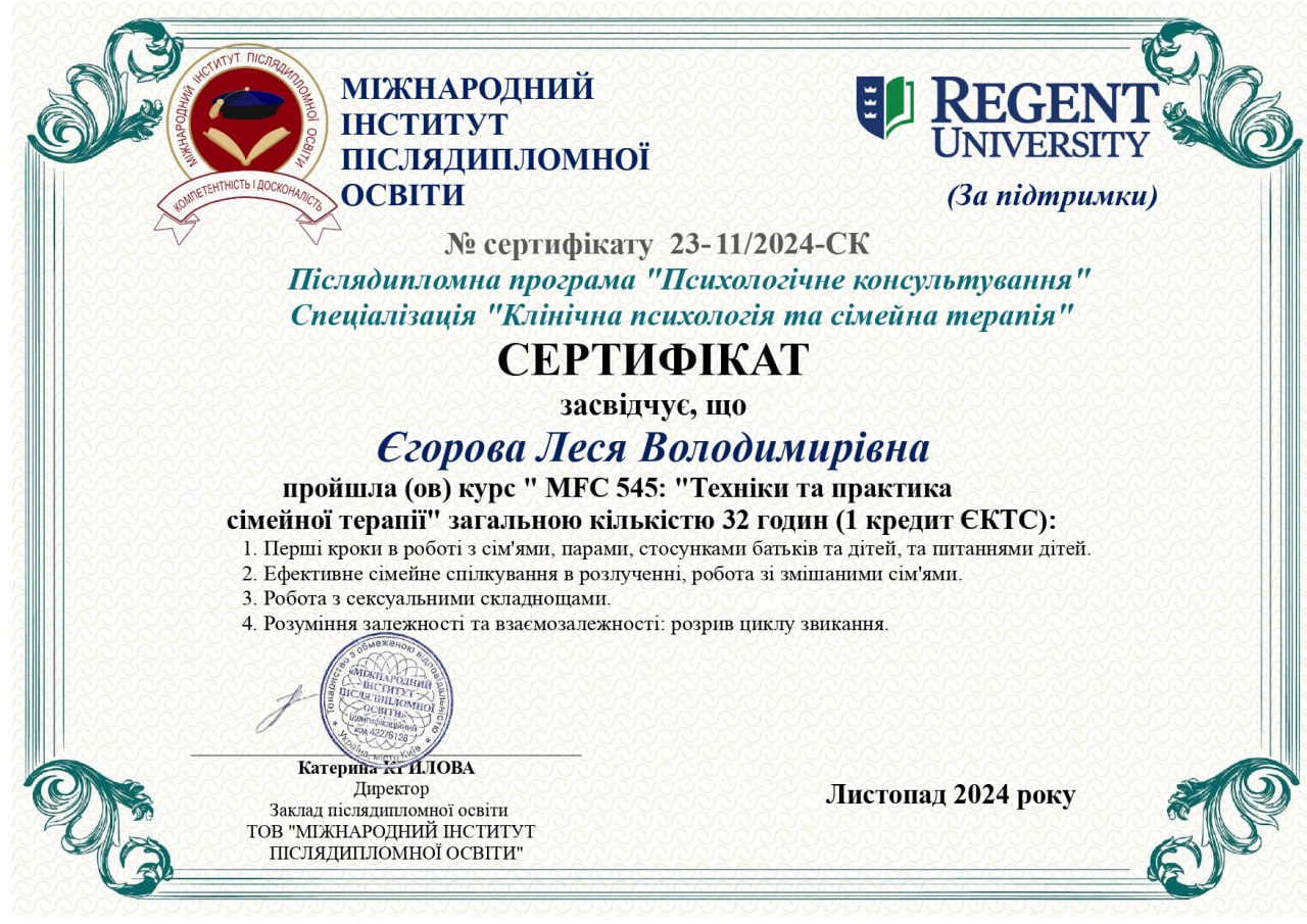 2024 — «Техніки та практика сімейної терапії», Міжнародний інститут післядипломної освіти / Regent University