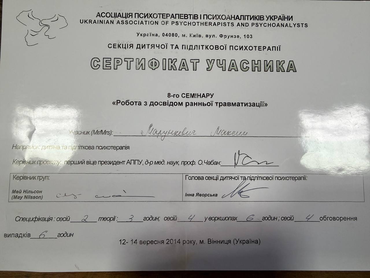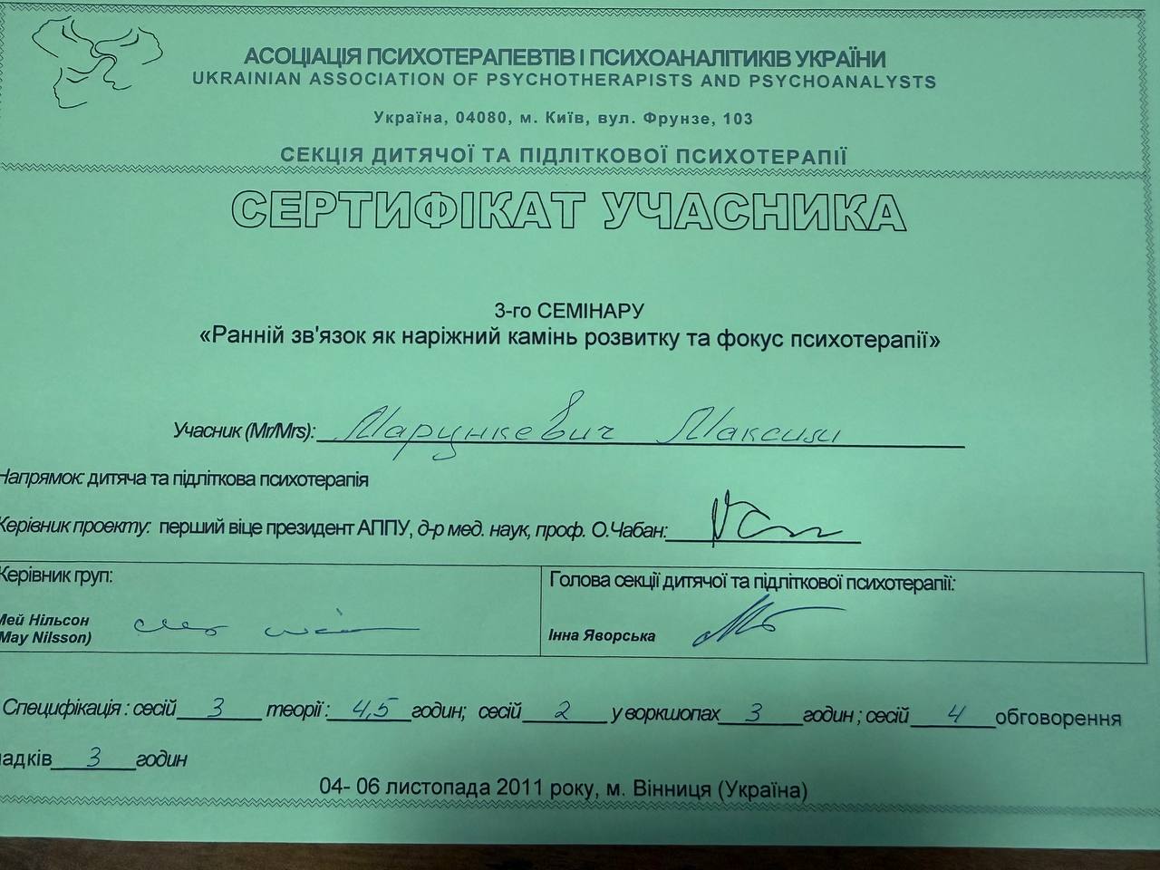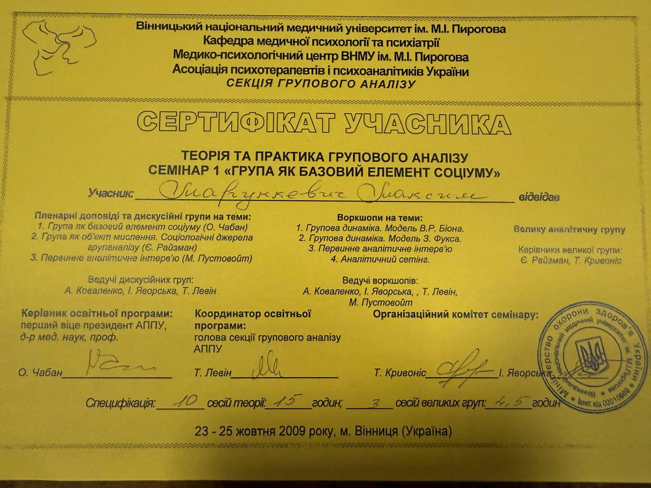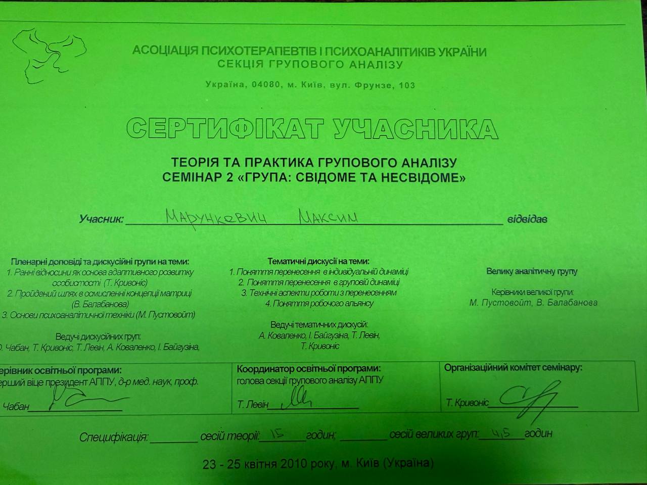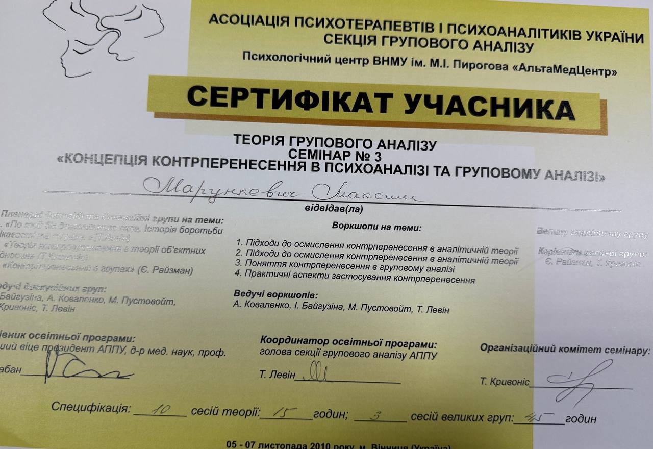2009–2014 — навчання на групового психоаналітика (включає 180 годин індивідуальної терапії)