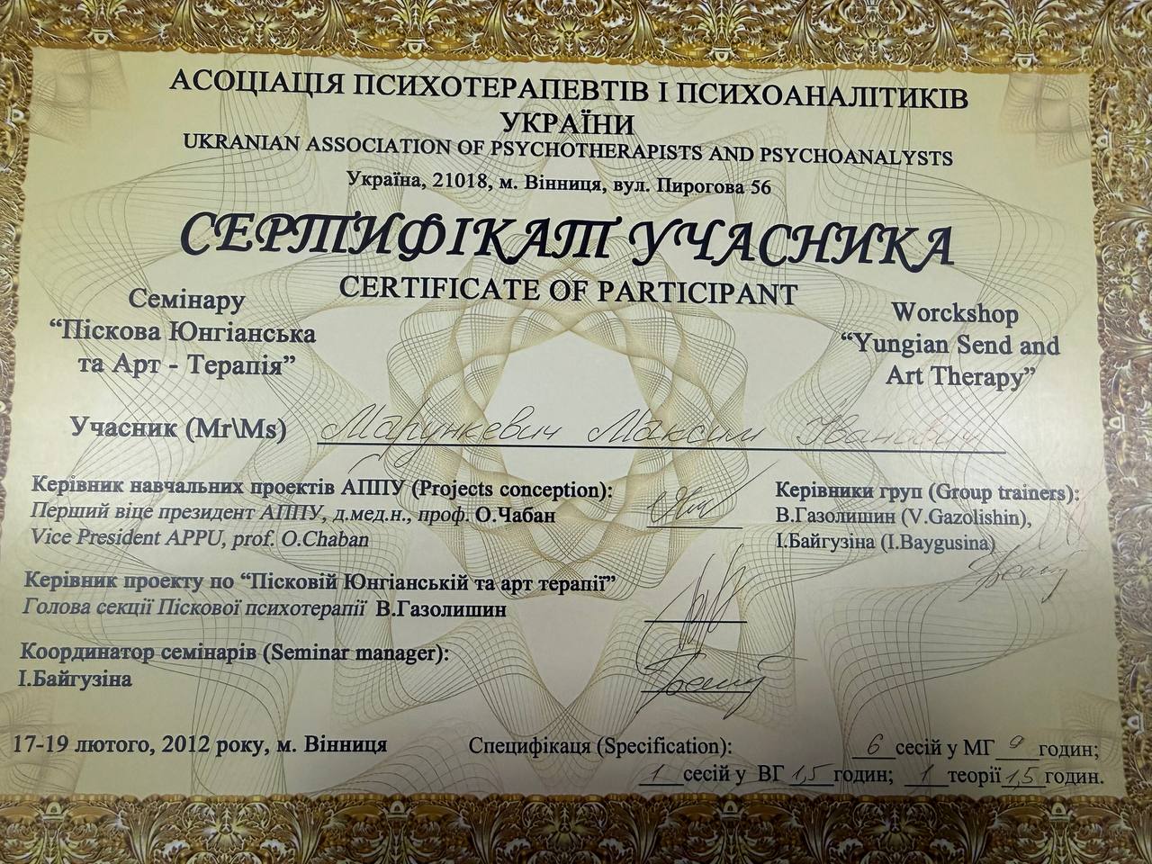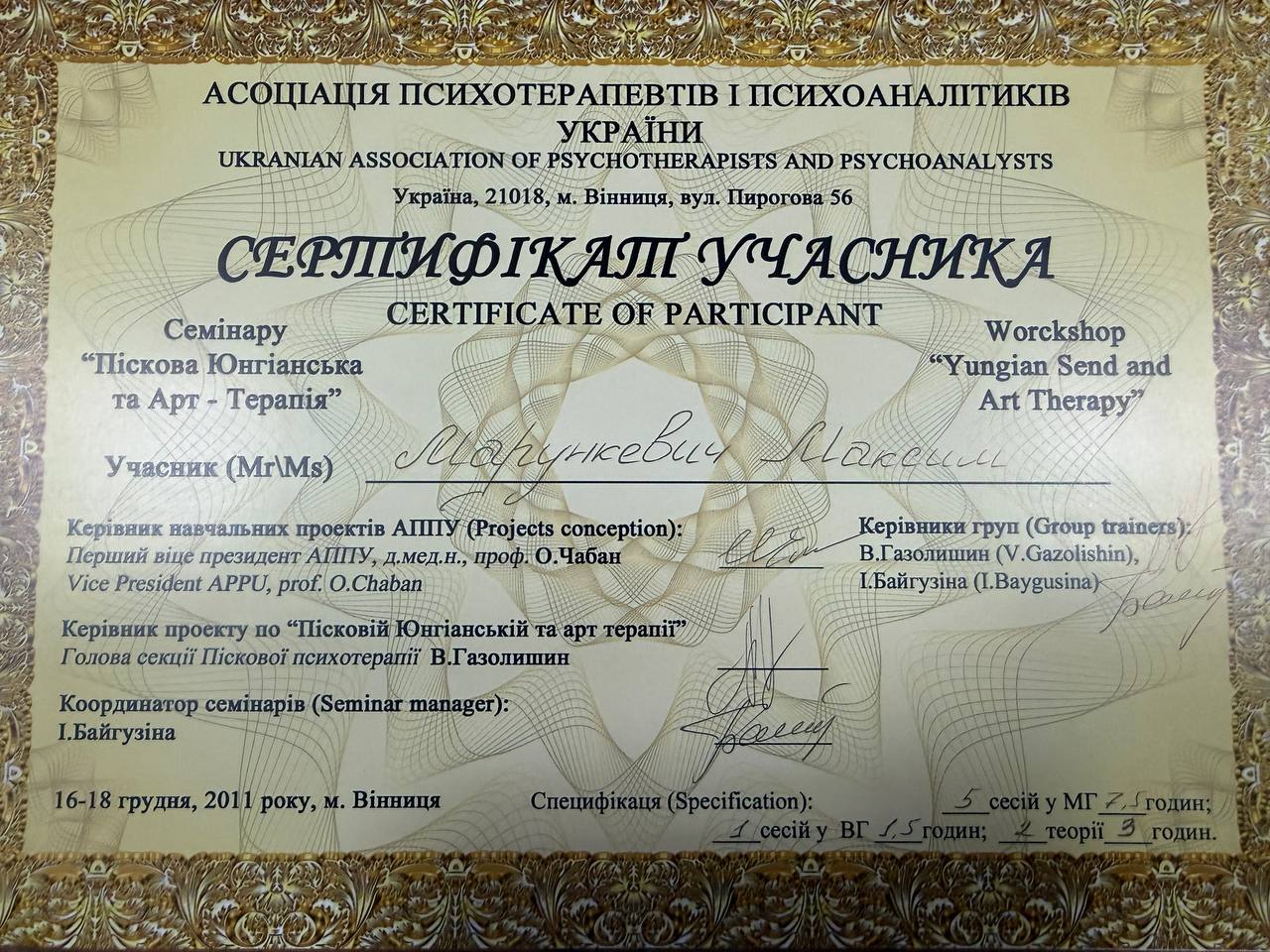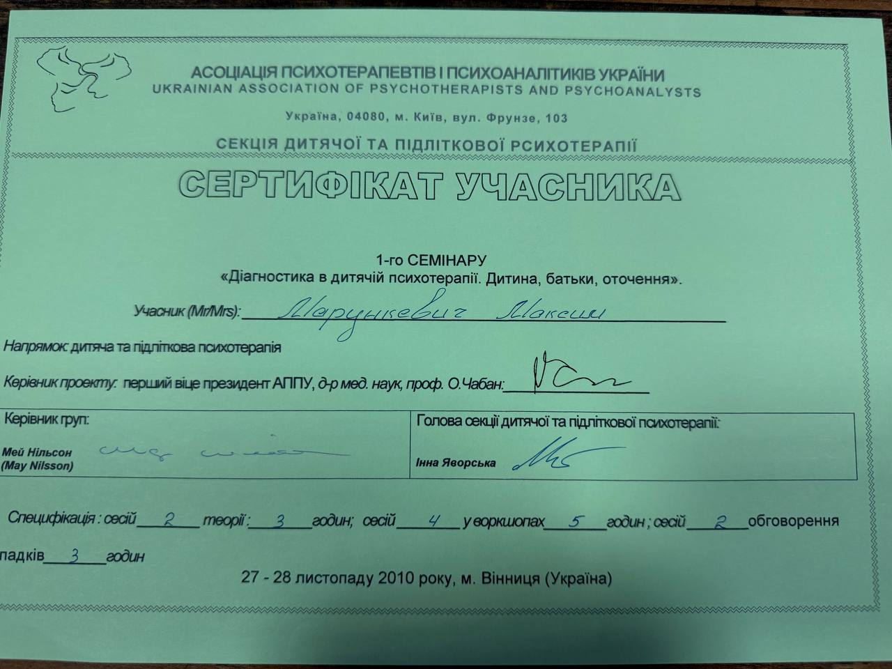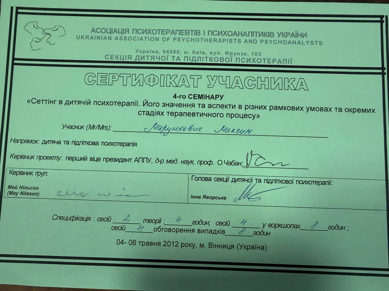 2009–2014 — навчання на групового психоаналітика (включає 180 годин індивідуальної терапії)