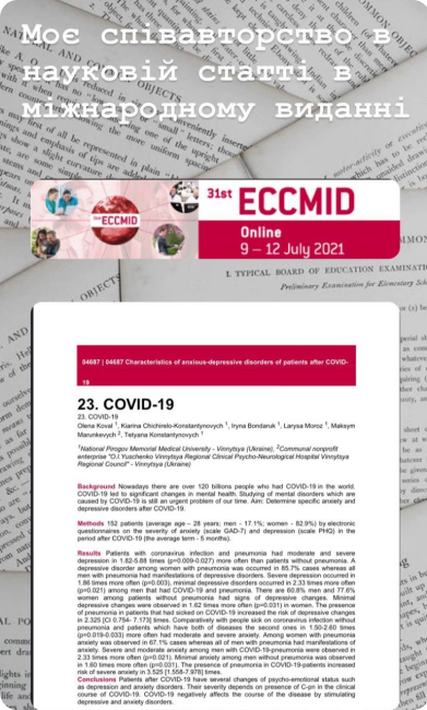 2021 — опубліковано наукову статтю у міжнародному науковому журналі на тему депресії та тривоги внаслідок COVID-19
