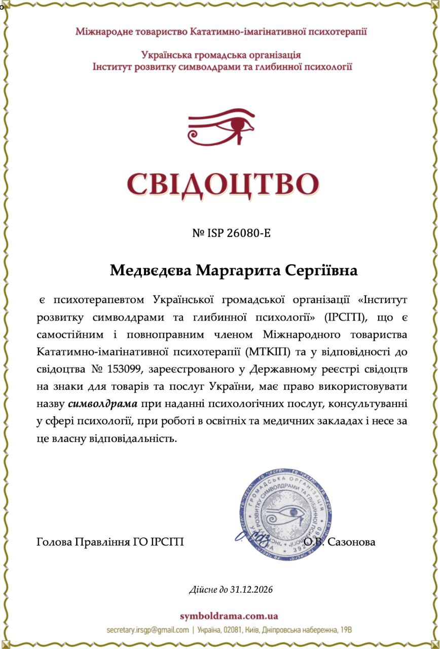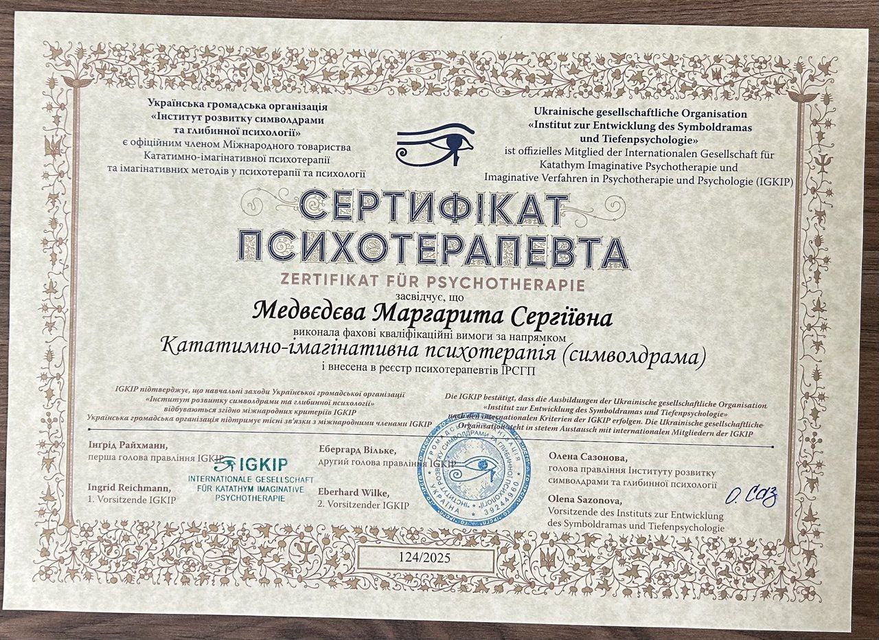 ІРСГП (Інститут розвитку символдрами та глибинної психології) – психотерапевт за методом кататимно-імагінативної психотерапії.