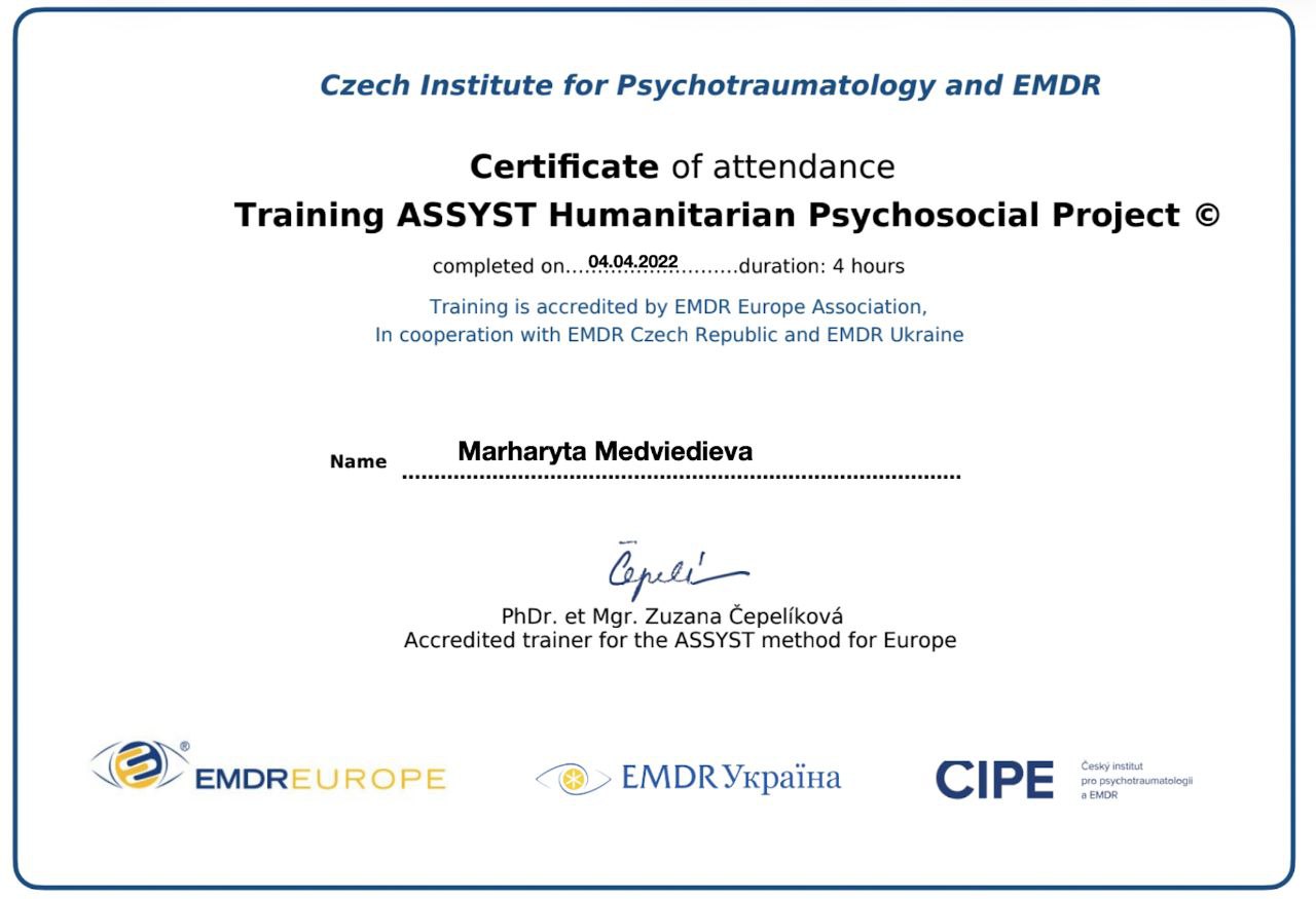 2022 —Training ASSYST Humanitarian Psychosocial Project, Czech Institute for Psychotraumatology and EMDR