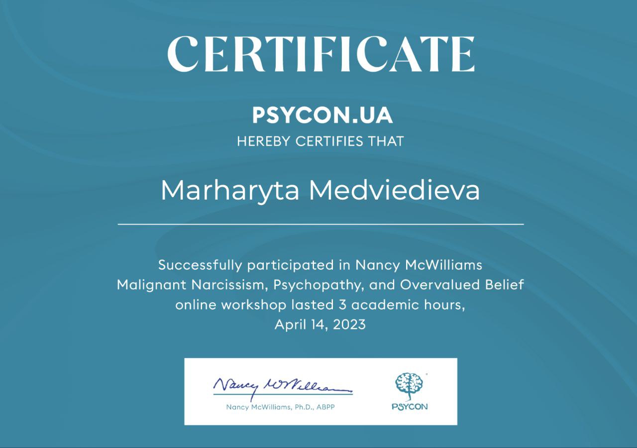 2023 — Онлайн-воркшоп Nancy McWilliams «Malignant Narcissism, Psychopathy, and Overvalued Belief»
