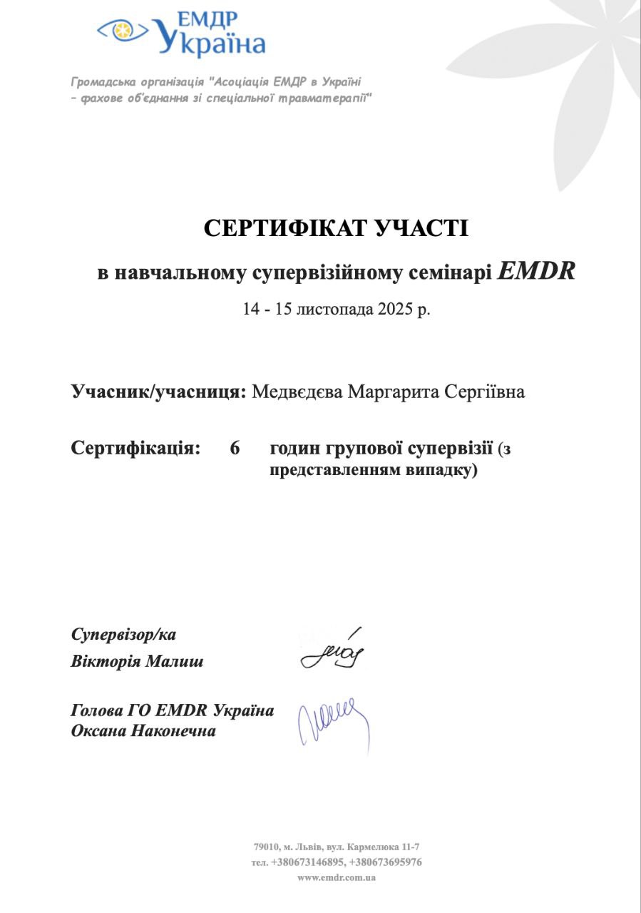 2025 — Онлайн-семінар EMDR «Основи психотравматології. Теорія та практика стабілізації», Асоціація EMDR Україна)