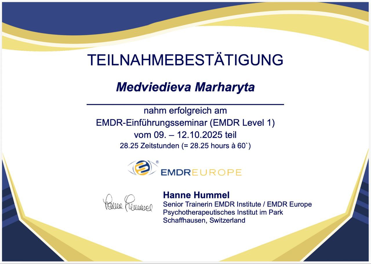 2025 — Вступний семінар EMDR Level 1, EMDR Europe / Psychotherapeutisches Institut im Park