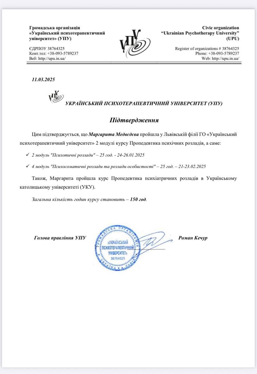2025 — Курс «Пропедевтика психічних розладів», ГО «Український психотерапевтичний університет»