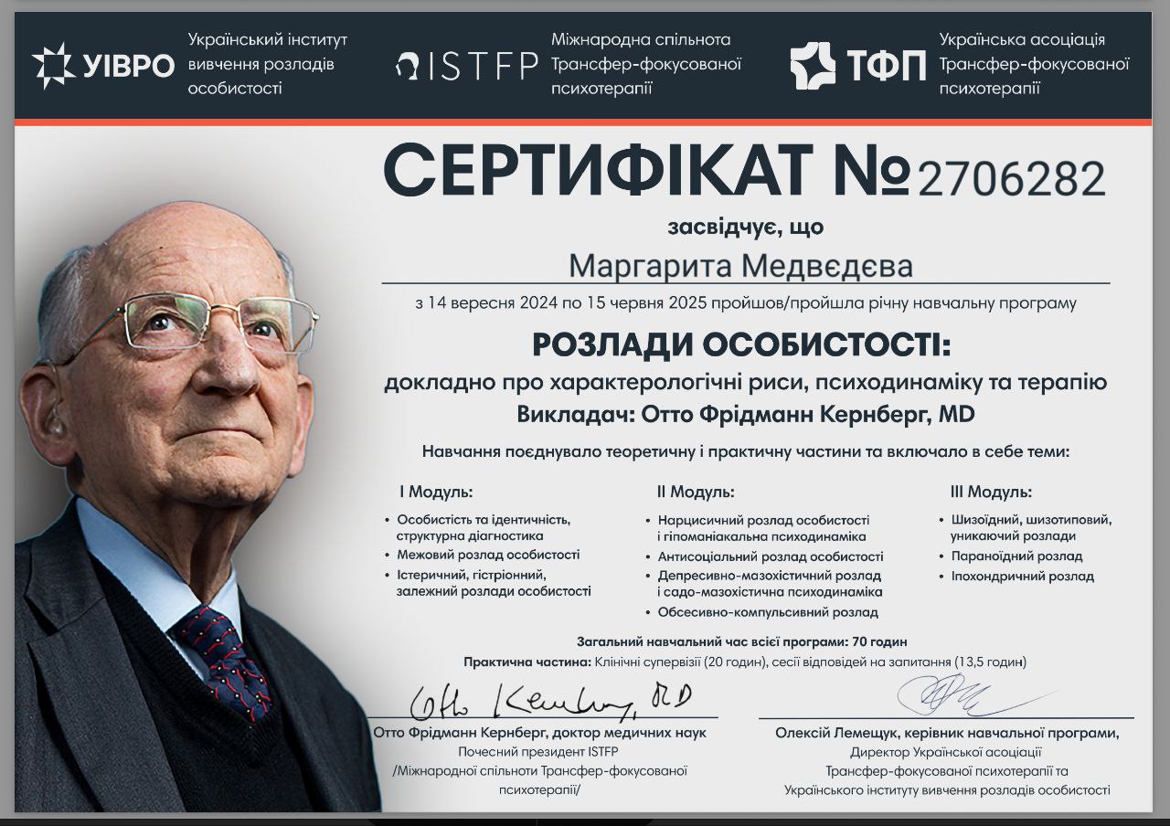 2024–2025 — Річна навчальна програма «Розлади особистості», викладач: Отто Кернберг, MD, Український інститут вивчення розладів особистості, ISTFP, ТФП
