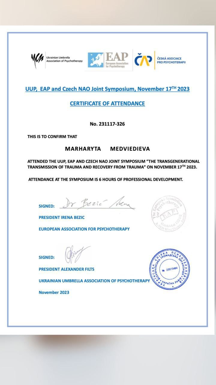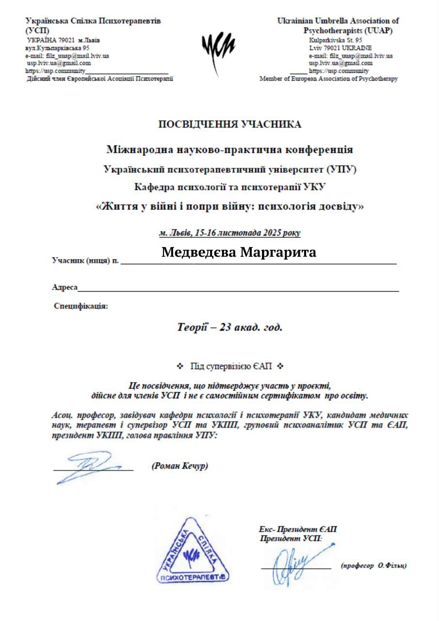 Додатково проходжу різні психологічні курси та семінари, а також беру участь у наукових конференціях.