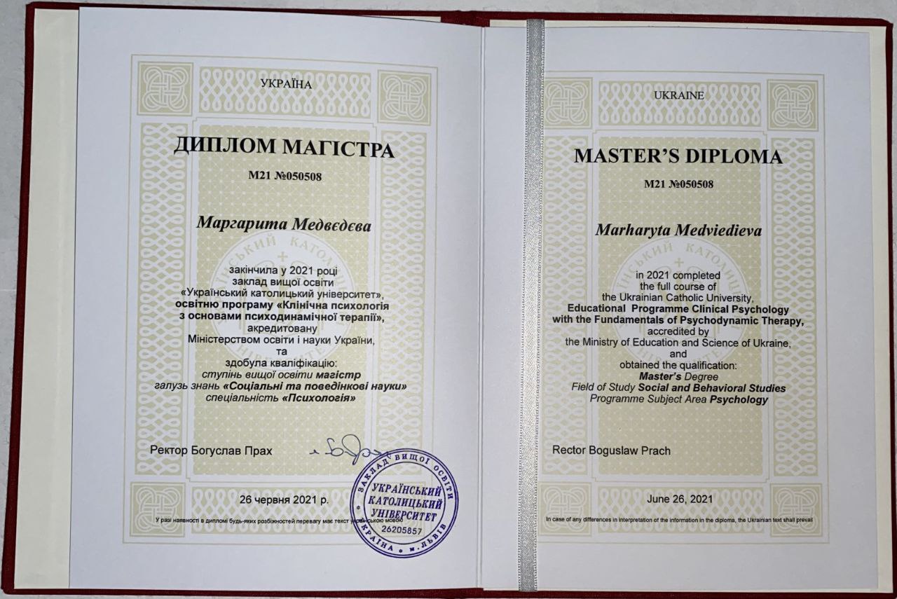 2021 —Магістр психології, Освітня програма «Клінічна психологія з основами психодинамічної терапії», Український католицький університет, м.Львів