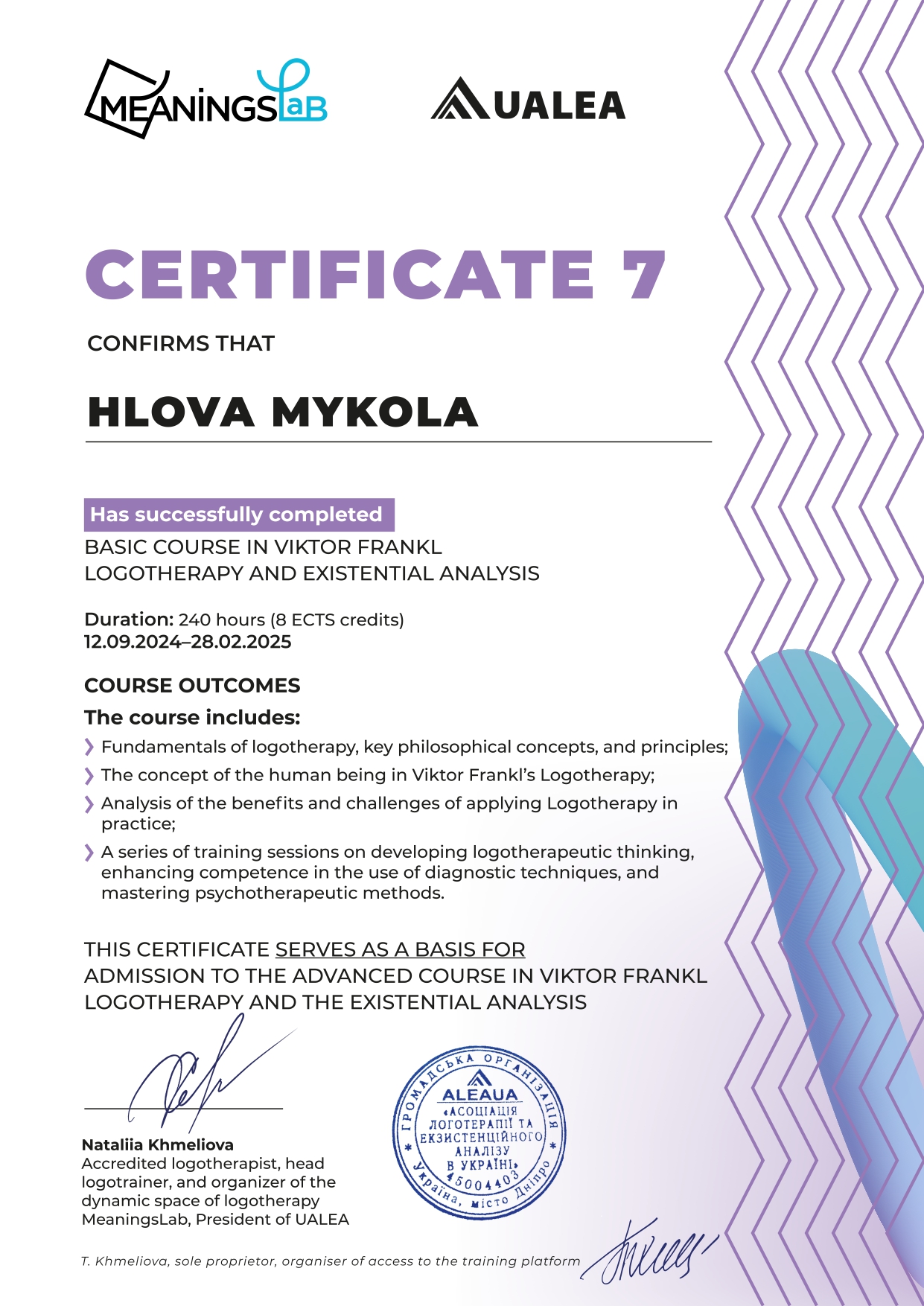 2024 -2025 — Базовий курс з логотерапії та екзистенційного аналізу Віктора Франкла, ГО «Асоціація логотерапії та екзистенційного аналізу в Україні»