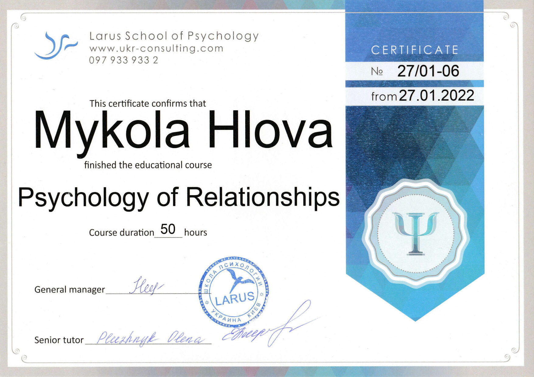 2022 — Курс «Психологія стосунків», Школа психології «Ларус»