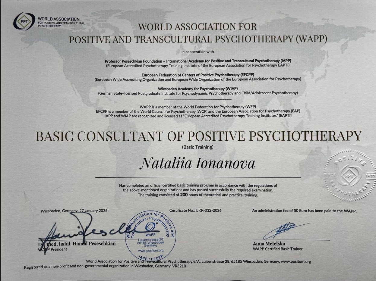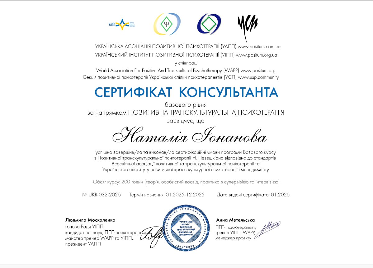 2025 — Позитивна транскультуральна психотерапія (базовий рівень консультанта), Українська асоціація позитивної психотерапії (УАПП), Український інститут позитивної психотерапії (УІПП)
