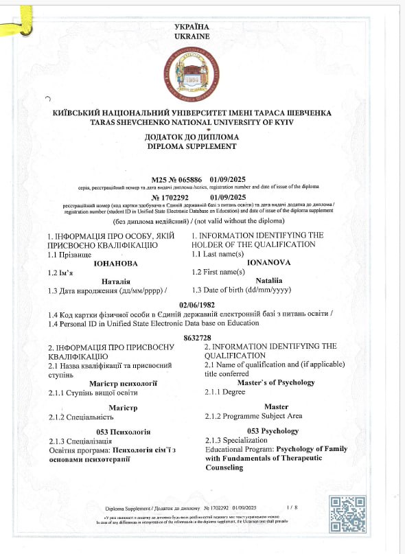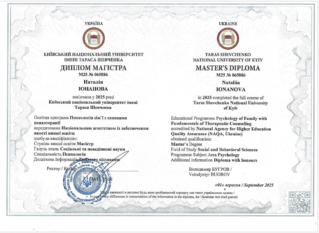 2025 — Магістр психології (Освітня програма: Психологія сім’ї з основами психотерапії), Київський національний університет імені Тараса Шевченка