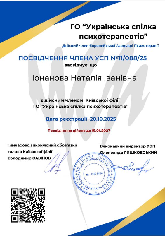Я приділяю особливу увагу якості своєї професійної практики та безпеці клієнтів, тому постійно розвиваю професійні компетенції, беру участь у навчальних програмах, професійних спільнотах та супервізіях.