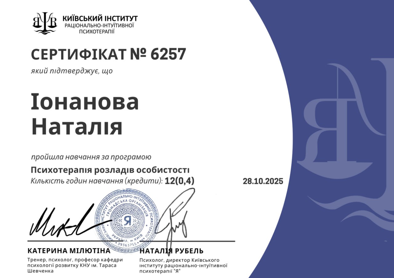 2025 — Психотерапія розладів особистості, Київський інститут раціонально-інтуїтивної психотерапії