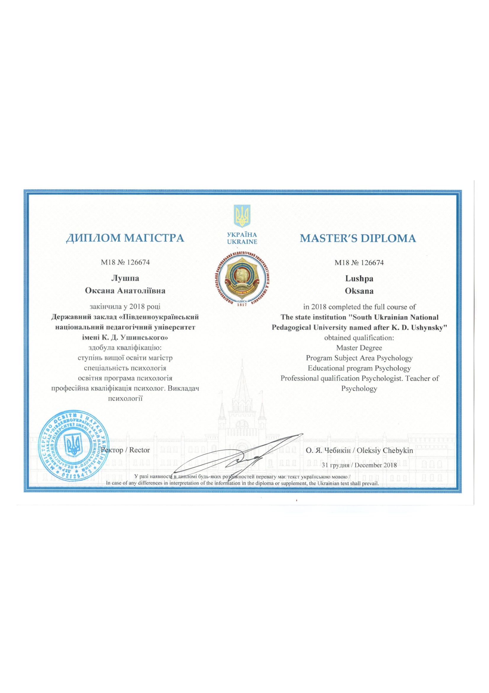 2016-2018 – магістр, професійна кваліфікація «Психолог. Викладач психології». Південноукраїнський національний педагогічний університет ім. К.Д. Ушинського (м.Одеса).