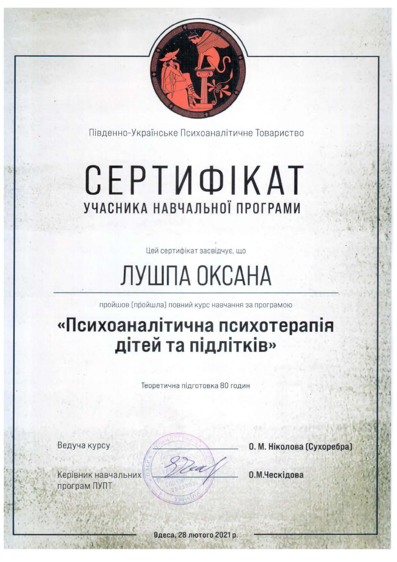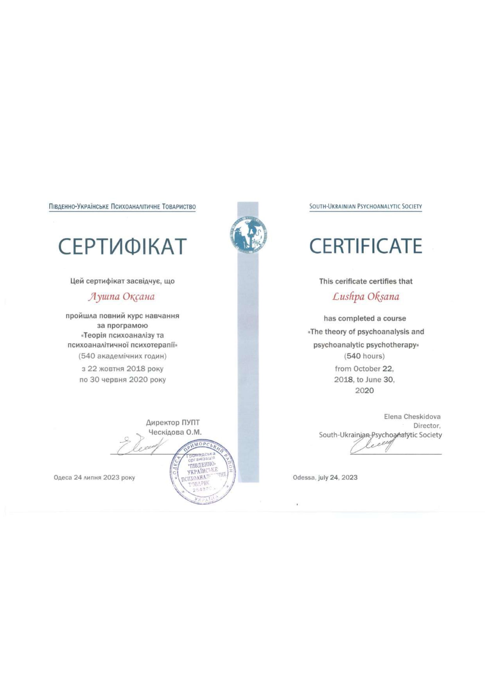 2018-2020 – навчання за програмою «Теорія психоаналізу та психоаналітичної психотерапії». Південно-Українське Психоаналітичне Товариство (м.Одеса).