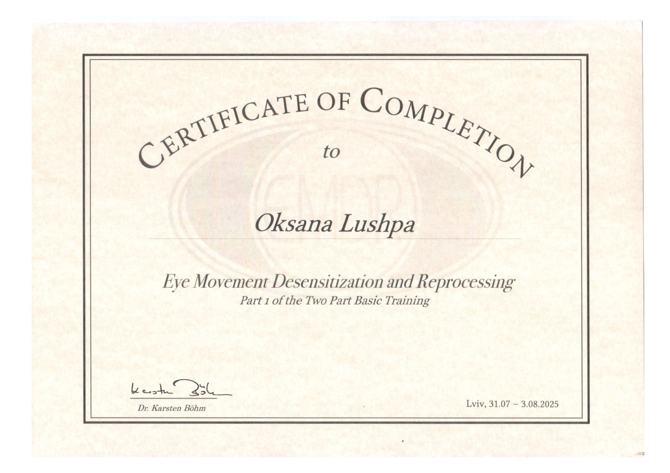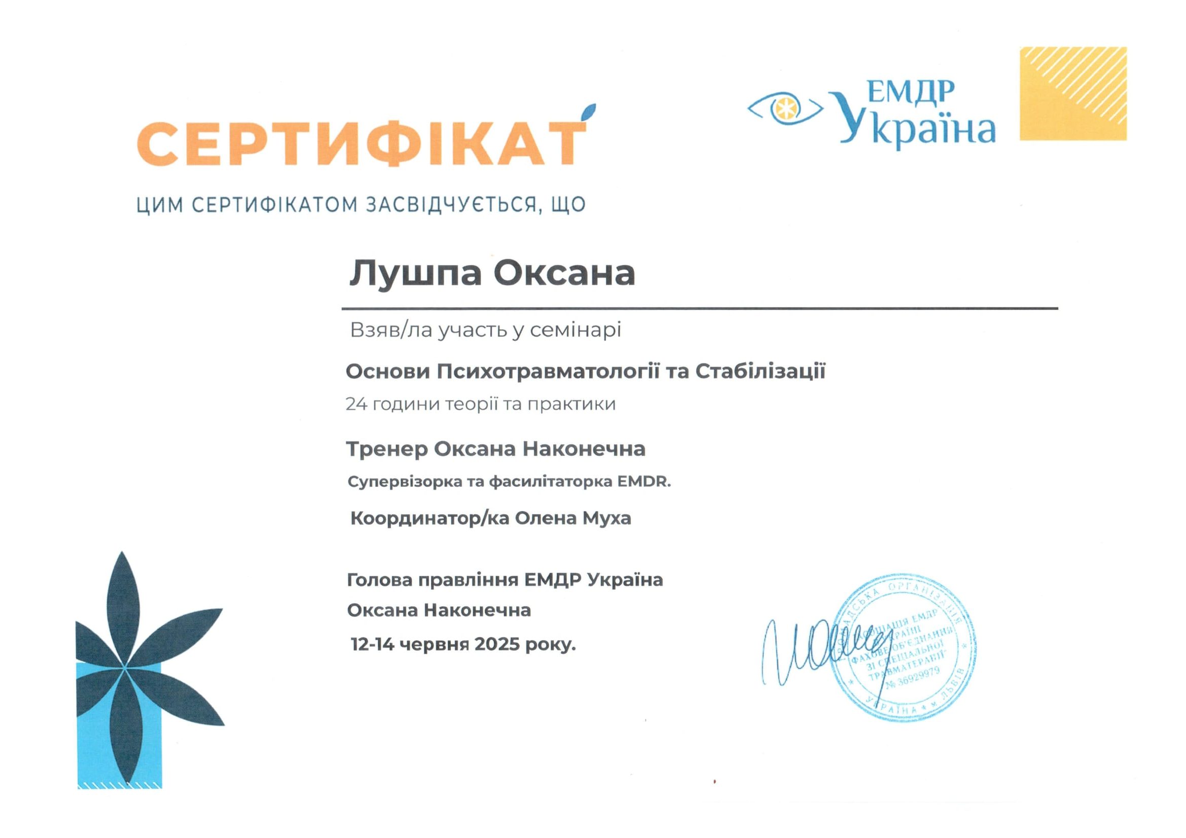 З 2025 року – навчаюсь на ЕMDR-терапевта. Асоціація ЕМДР Україна (м.Львів).