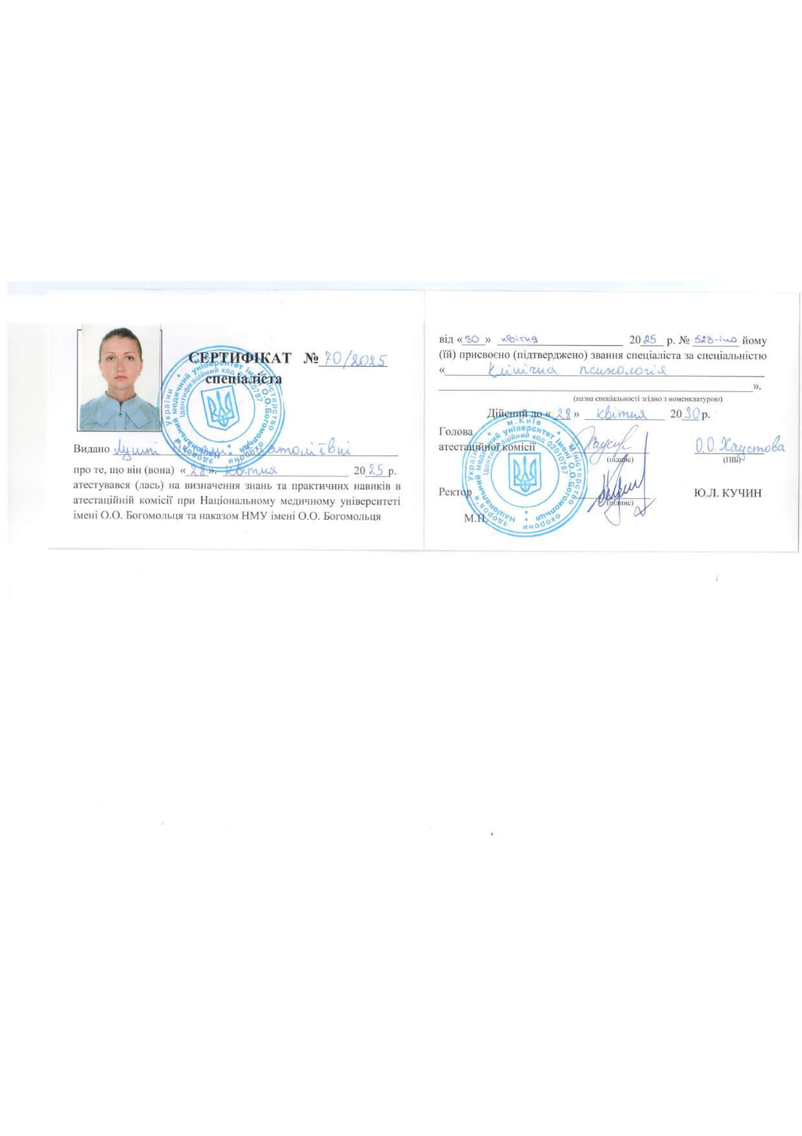 2024-2025 – атестація на присвоєння звання спеціаліста за спеціальністю «Клінічна психологія». Національний медичний університет ім. О.О. Богомольця (м.Київ).