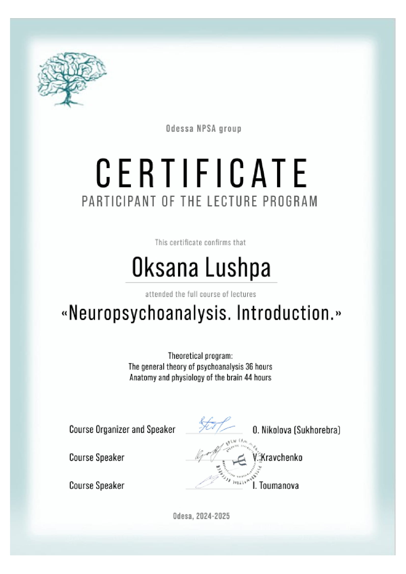 2024-2025 – навчальний курс «Нейропсихоаналіз. Анатомія та фізіологія мозку». Odessa NPSA group.