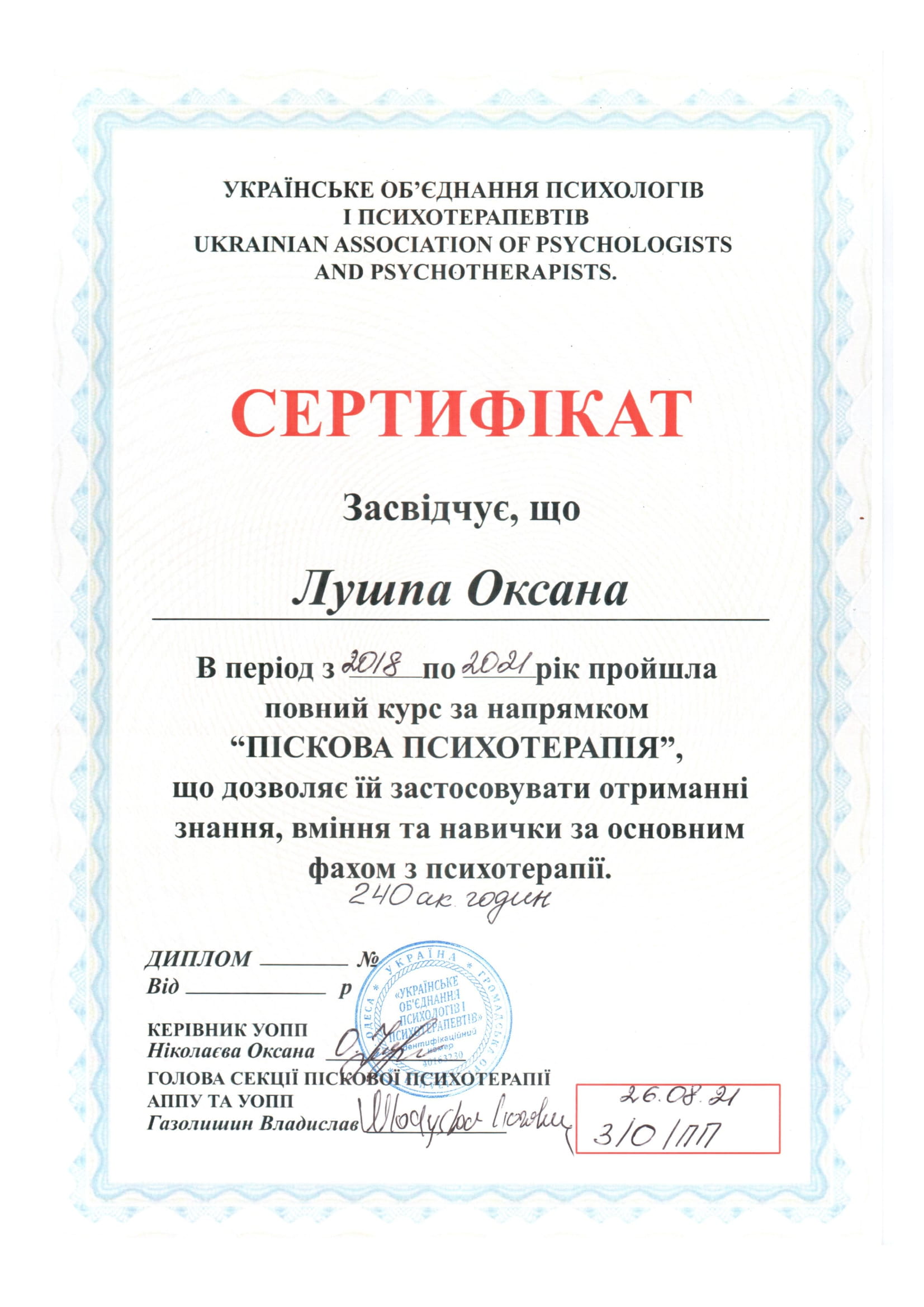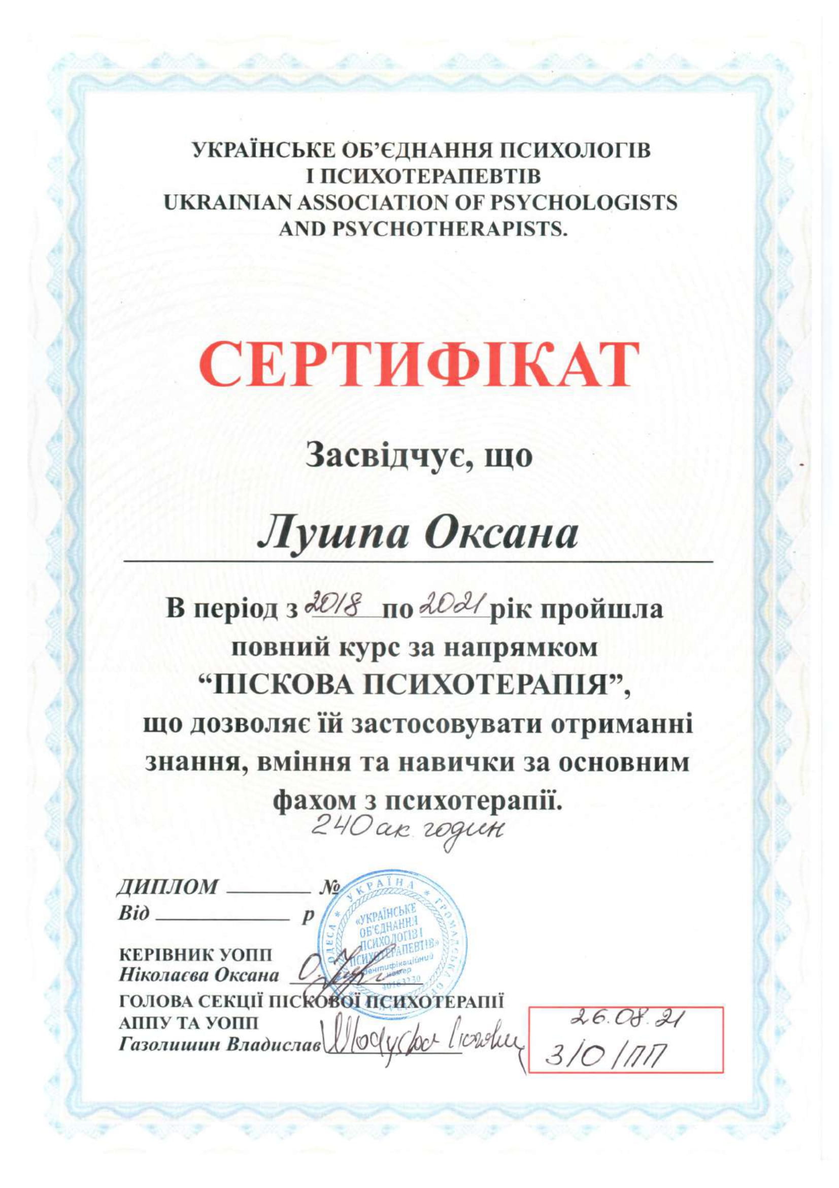 2018-2021 – спеціалізація «Піскова психотерапія». Українське Об’єднання Психологів і Психотерапевтів (м.Одеса).