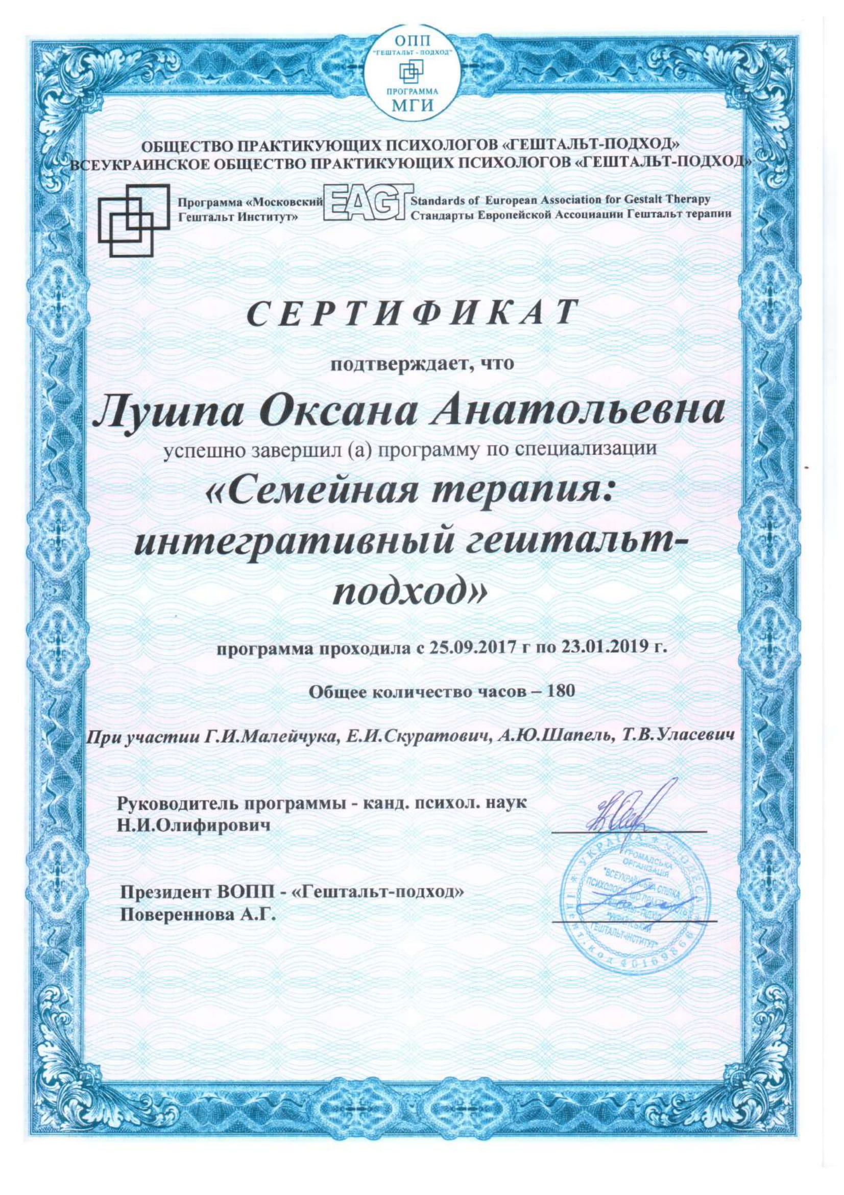 2017-2019 – спеціалізація «Сімейна терапія» за стандартами Європейської Асоціації Гештальт Терапії.