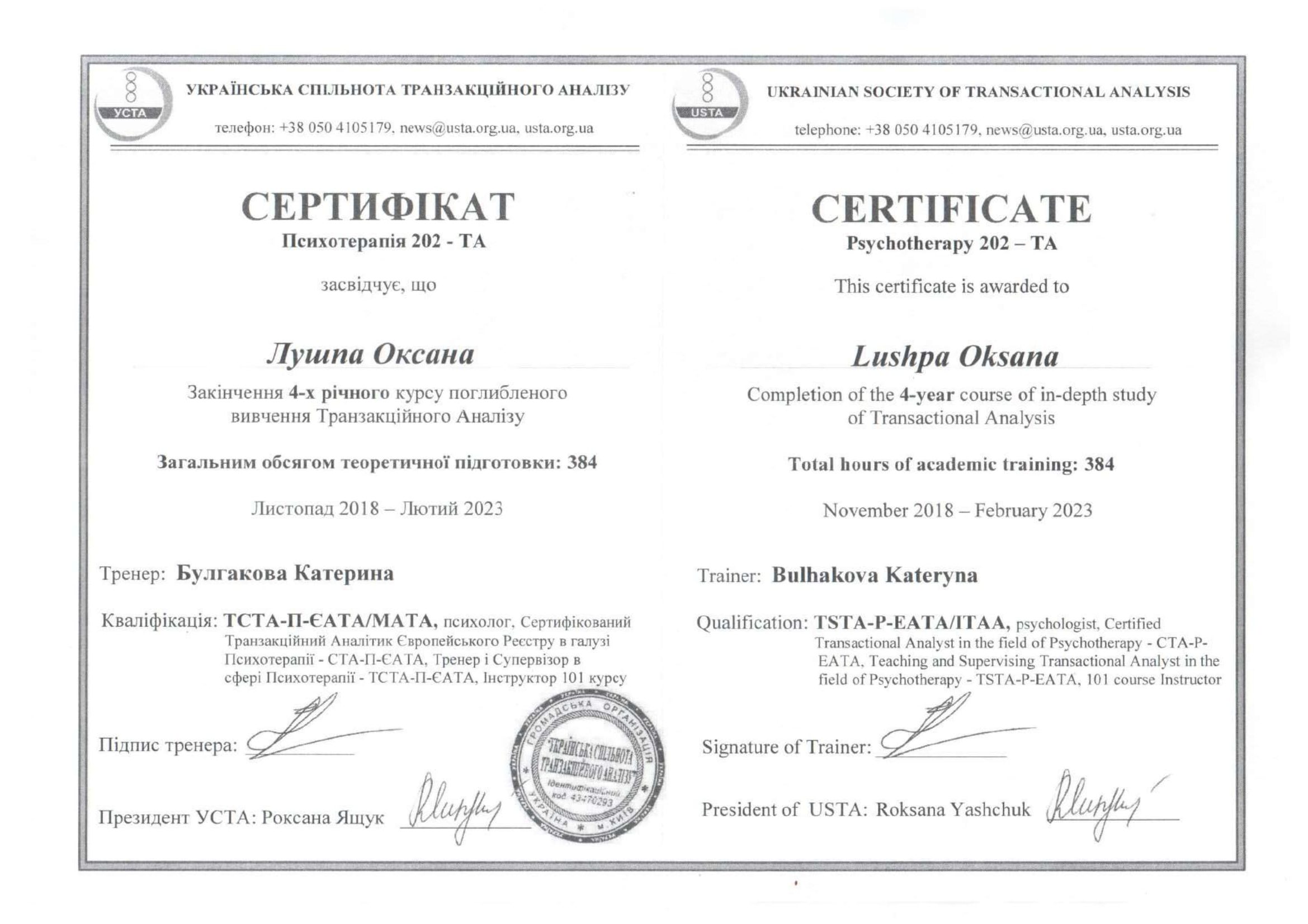 2023 – навчальний курс «Трансфер-Фокусована психотерапія при межових, нарцисичних та інших важких розладах особистості» Френка Йоманса. Українська Асоціація Трансфер-Фокусованої Психотерапії.