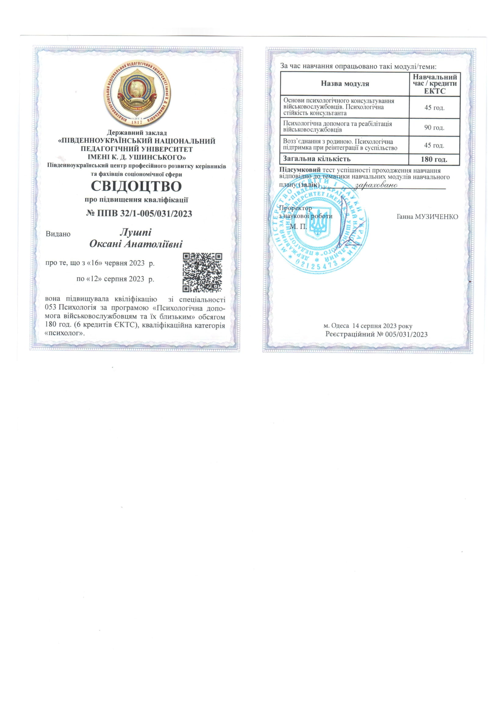 2023 – підвищення кваліфікації за програмою «Психологічна допомога військовослужбовцям та їх близьким». Південноукраїнський національний педагогічний університет ім. К.Д. Ушинського (м.Одеса).
