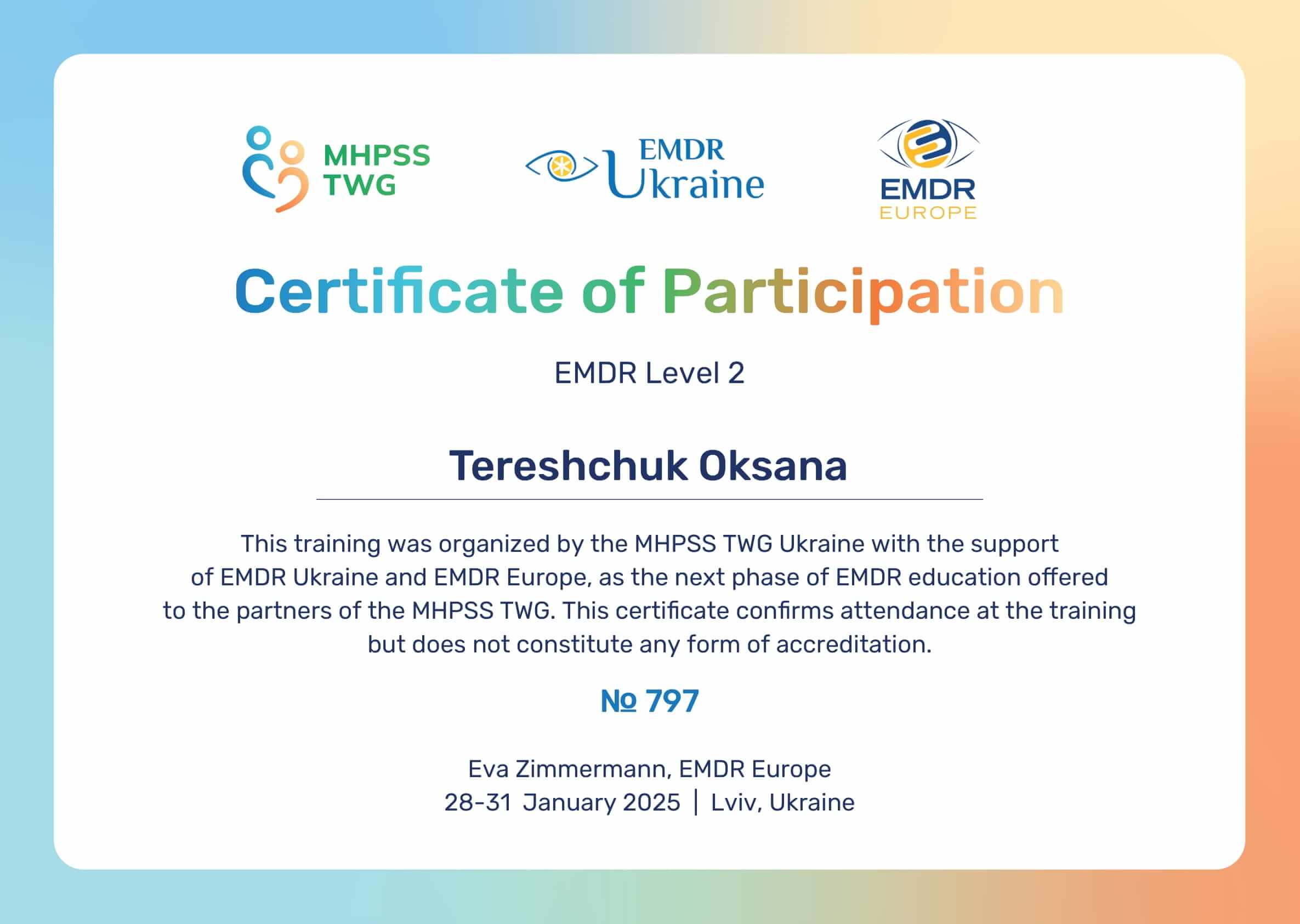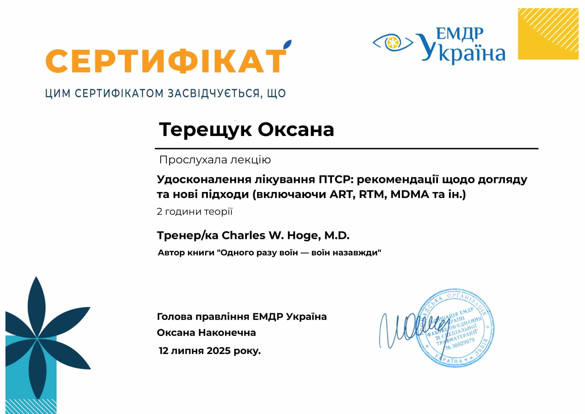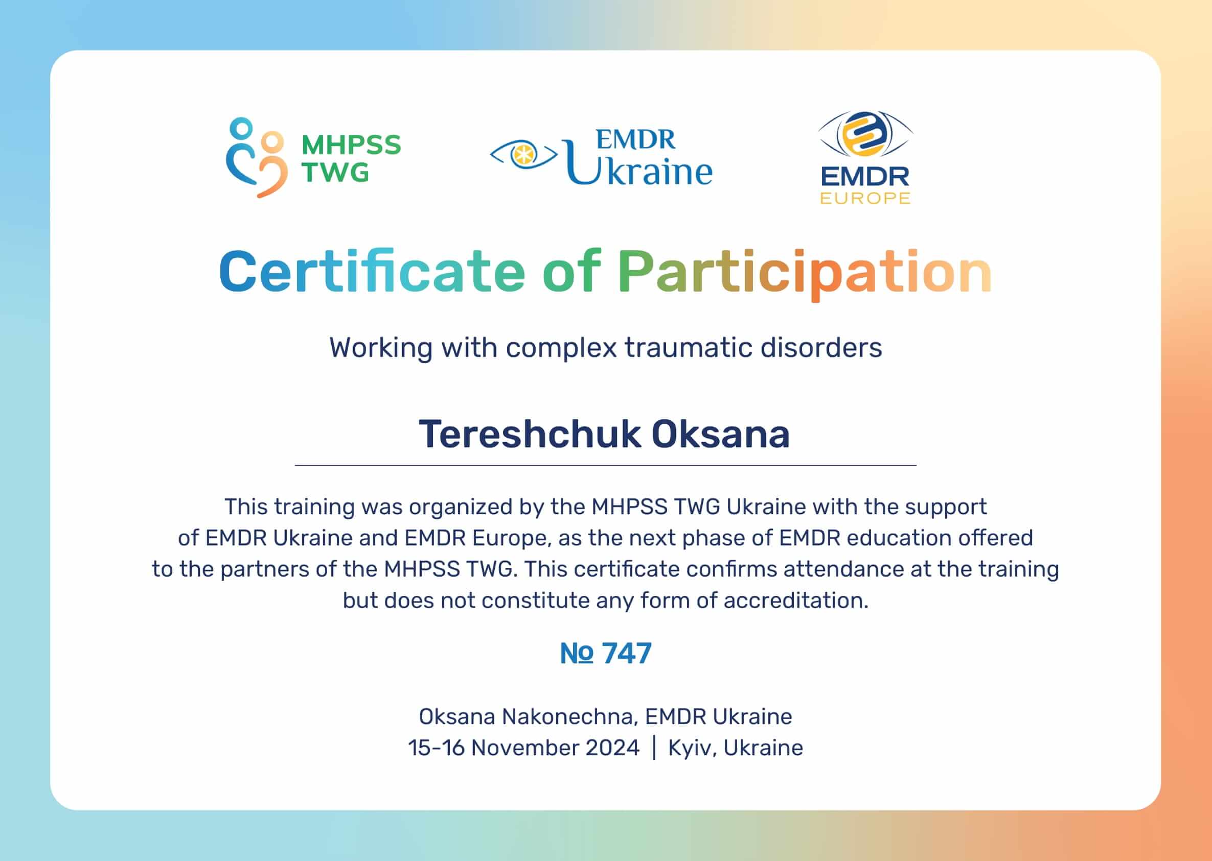 - 2025 р «Особливості застосування терапії EMDR при комплексній травмі та дисоціативних розладах» (24 год.);