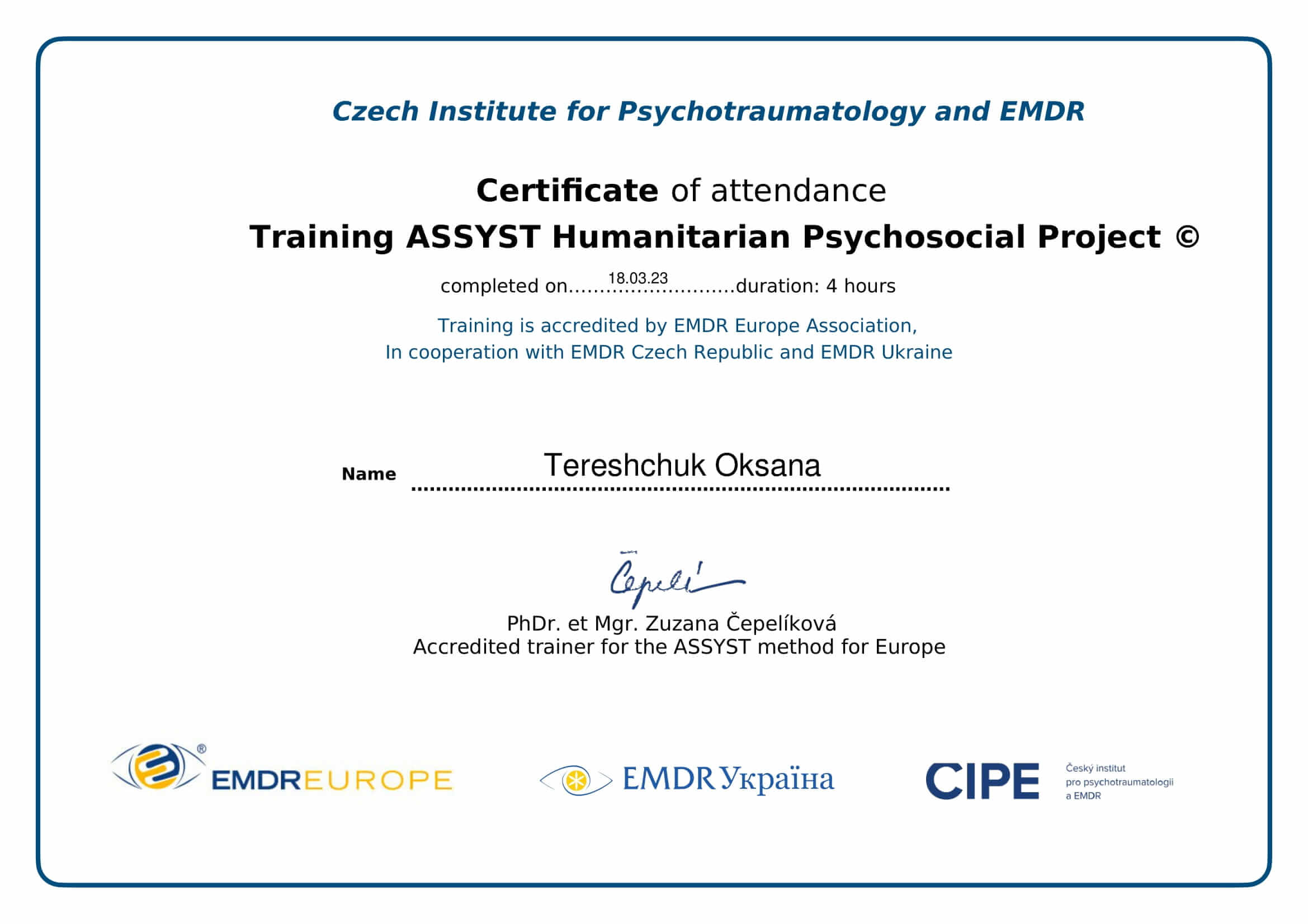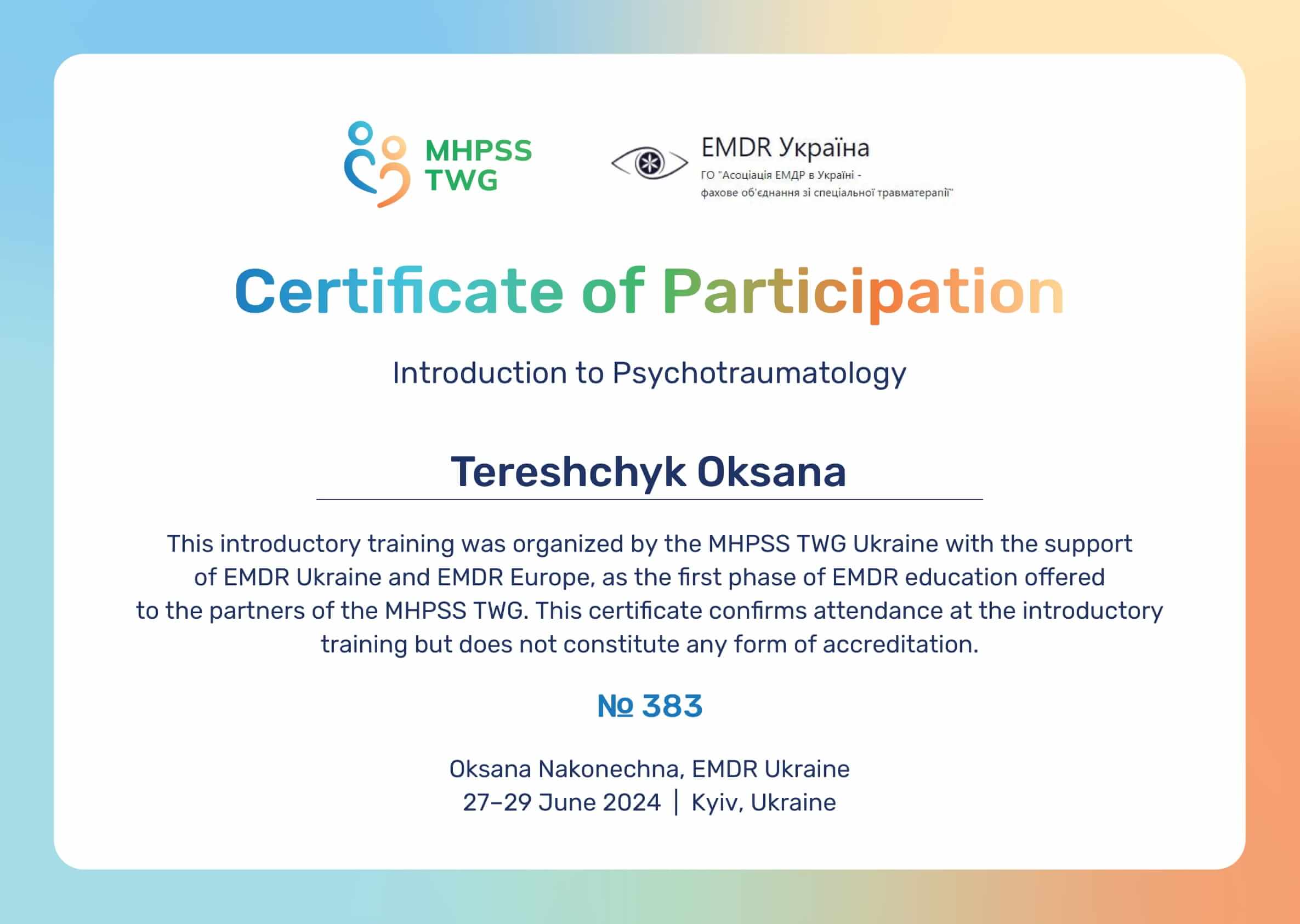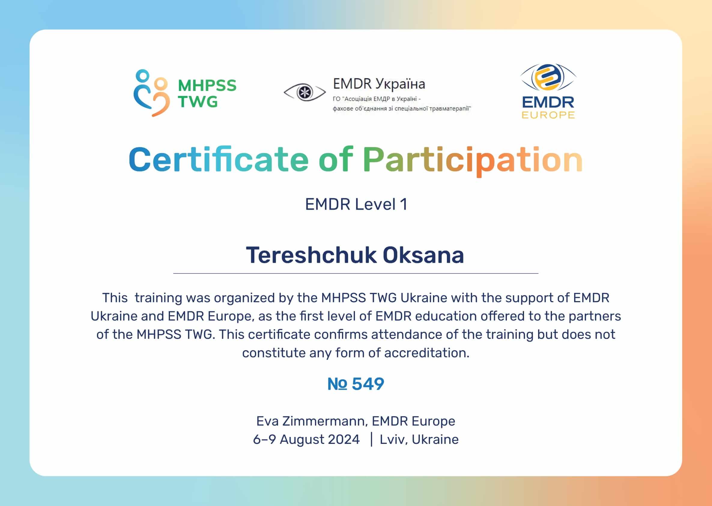 - 2025 р «Особливості застосування терапії EMDR при комплексній травмі та дисоціативних розладах» (24 год.);