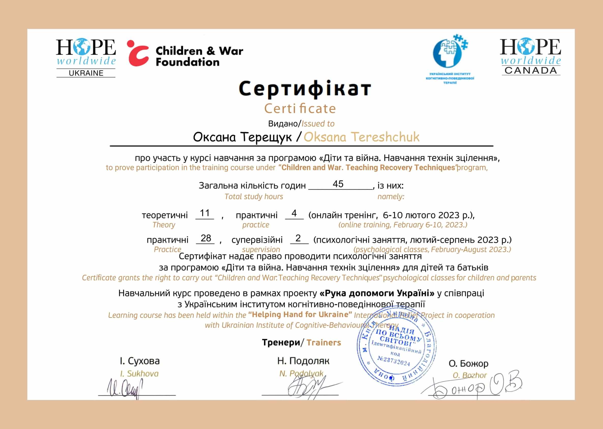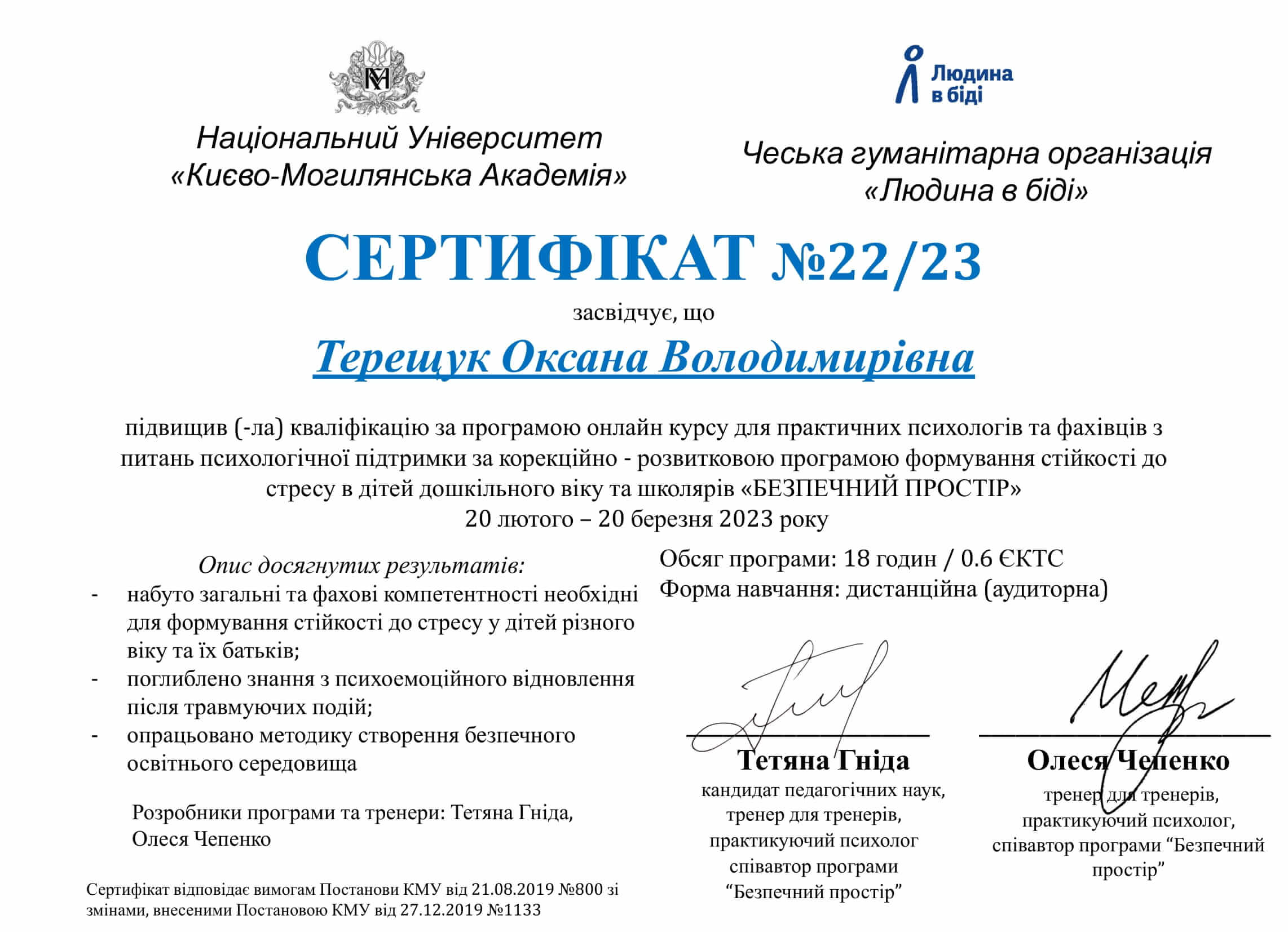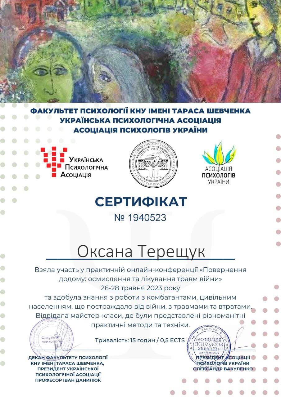 - 2023 рік курсі навчання за програмою «Діти та війна. Навчання технік зцілення» (45 годин);