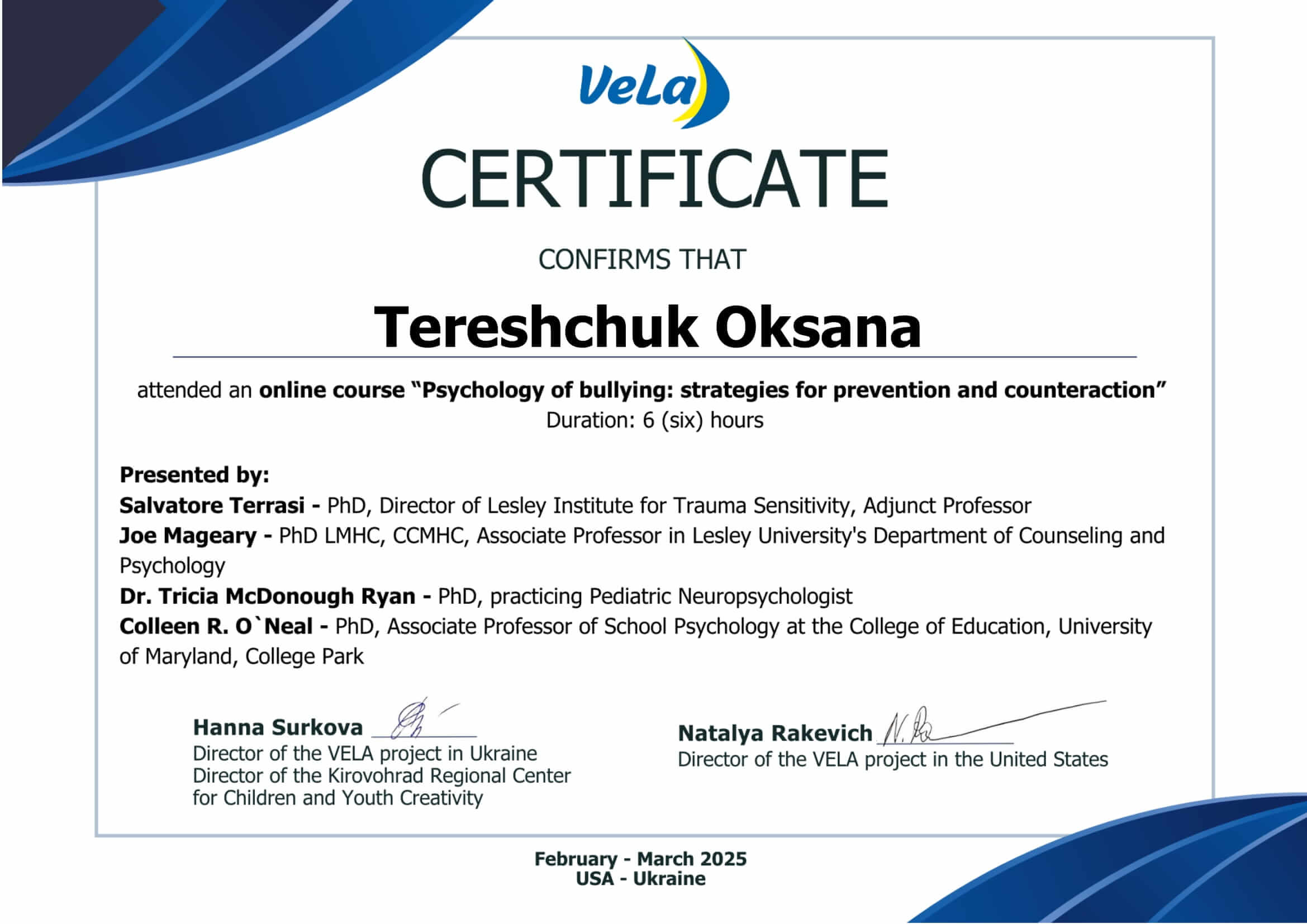 - 2025 р. курс “Психологія булінгу” (7 годин);