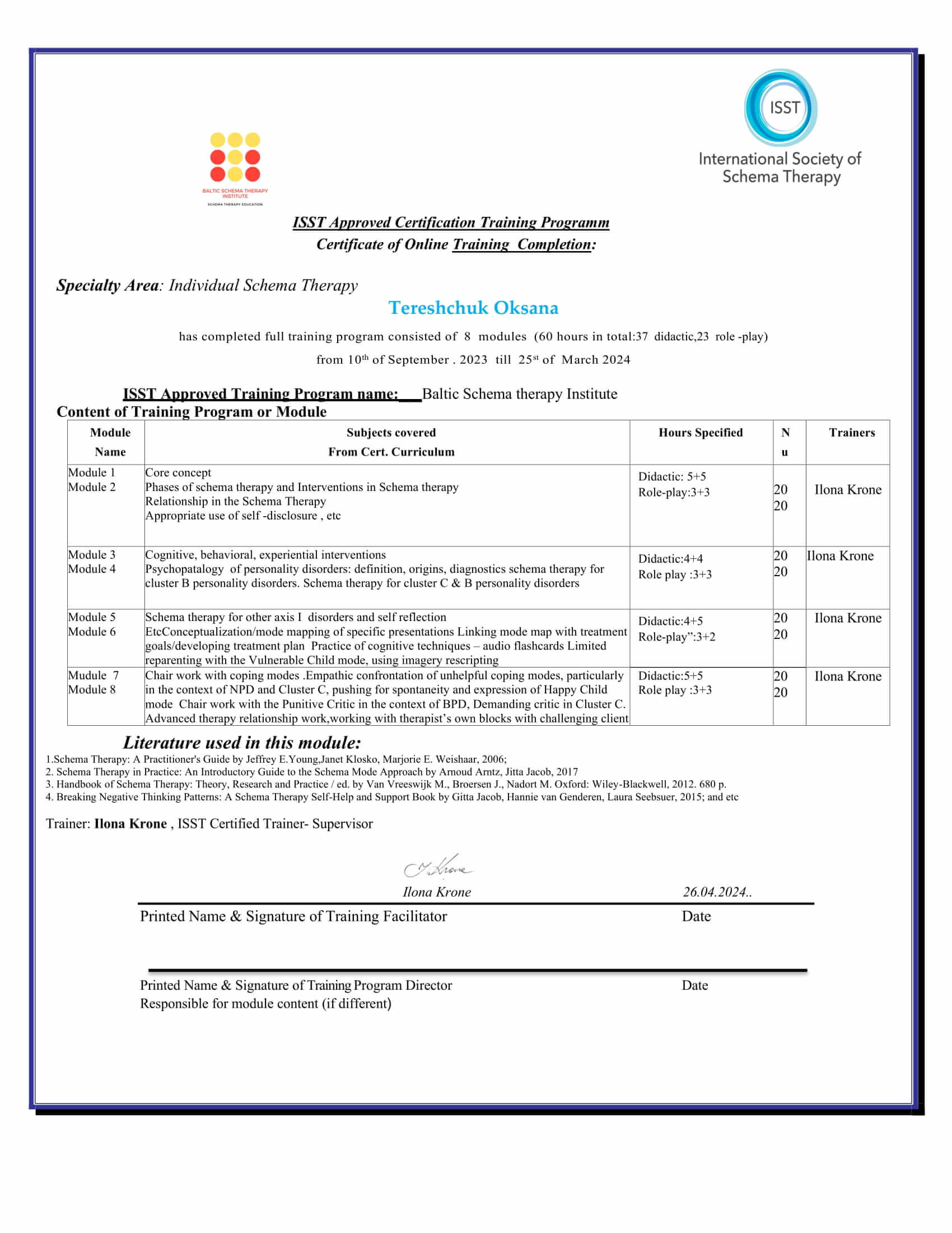 - Вересень 2023- березень -2024рік- Програма « Терапія за індивідуальними схемами»(60 годин);ISST Approved Certification Training Programm Certificate of Online Training Completion: Individual Schema Therapy. Baltic Schema therapy Institute/Trainer: Ilona Krone , ISST Certified Trainer- Supervisor ;
