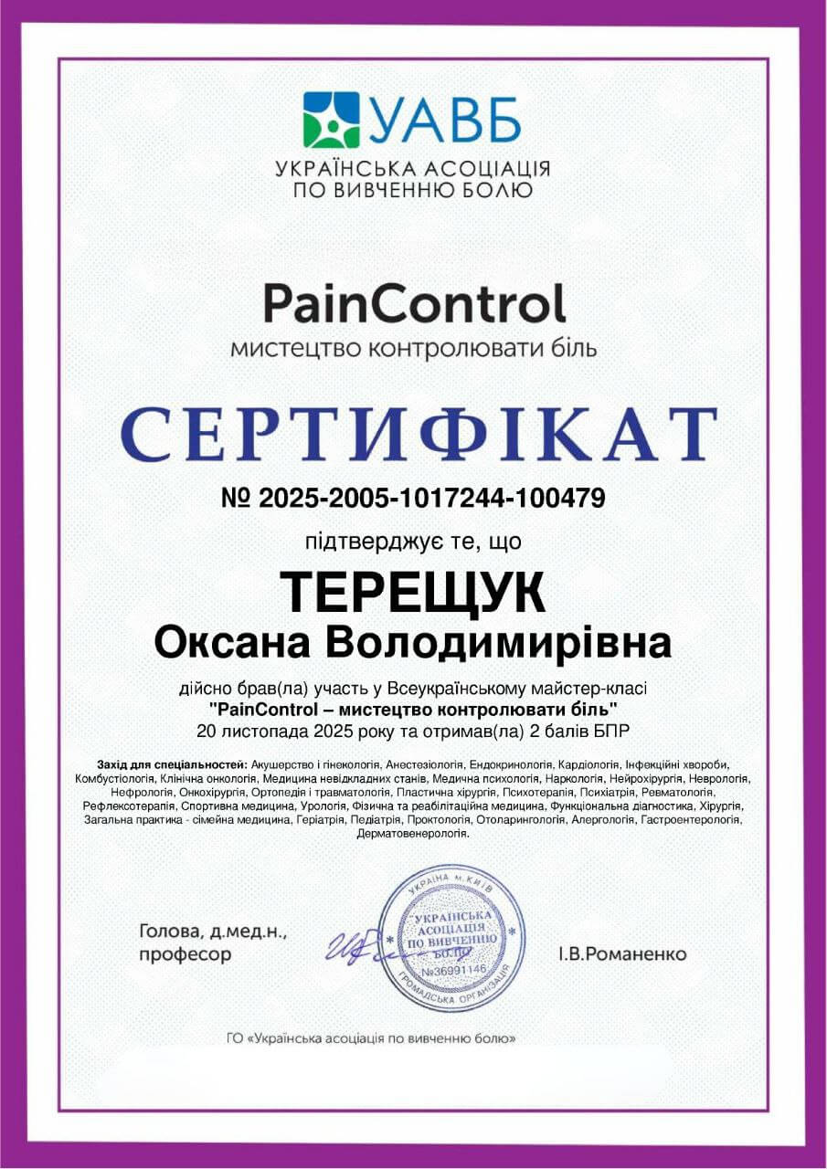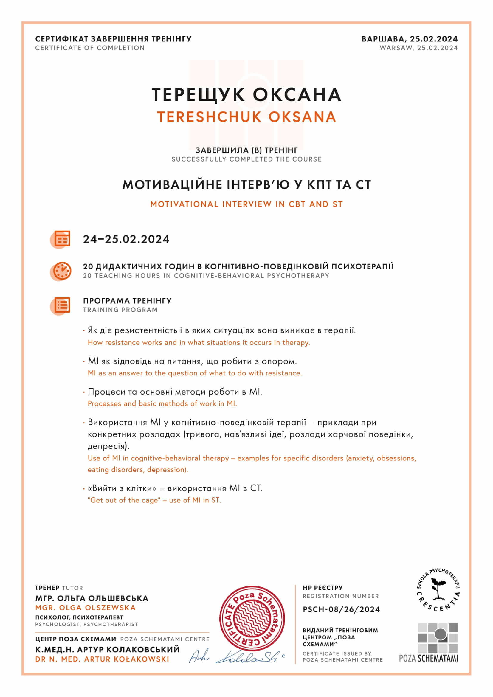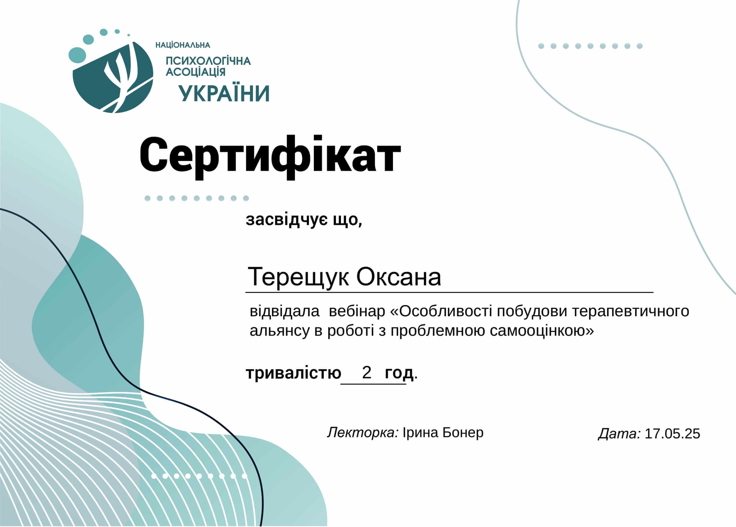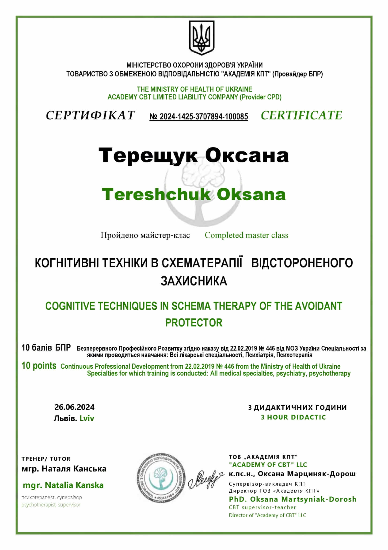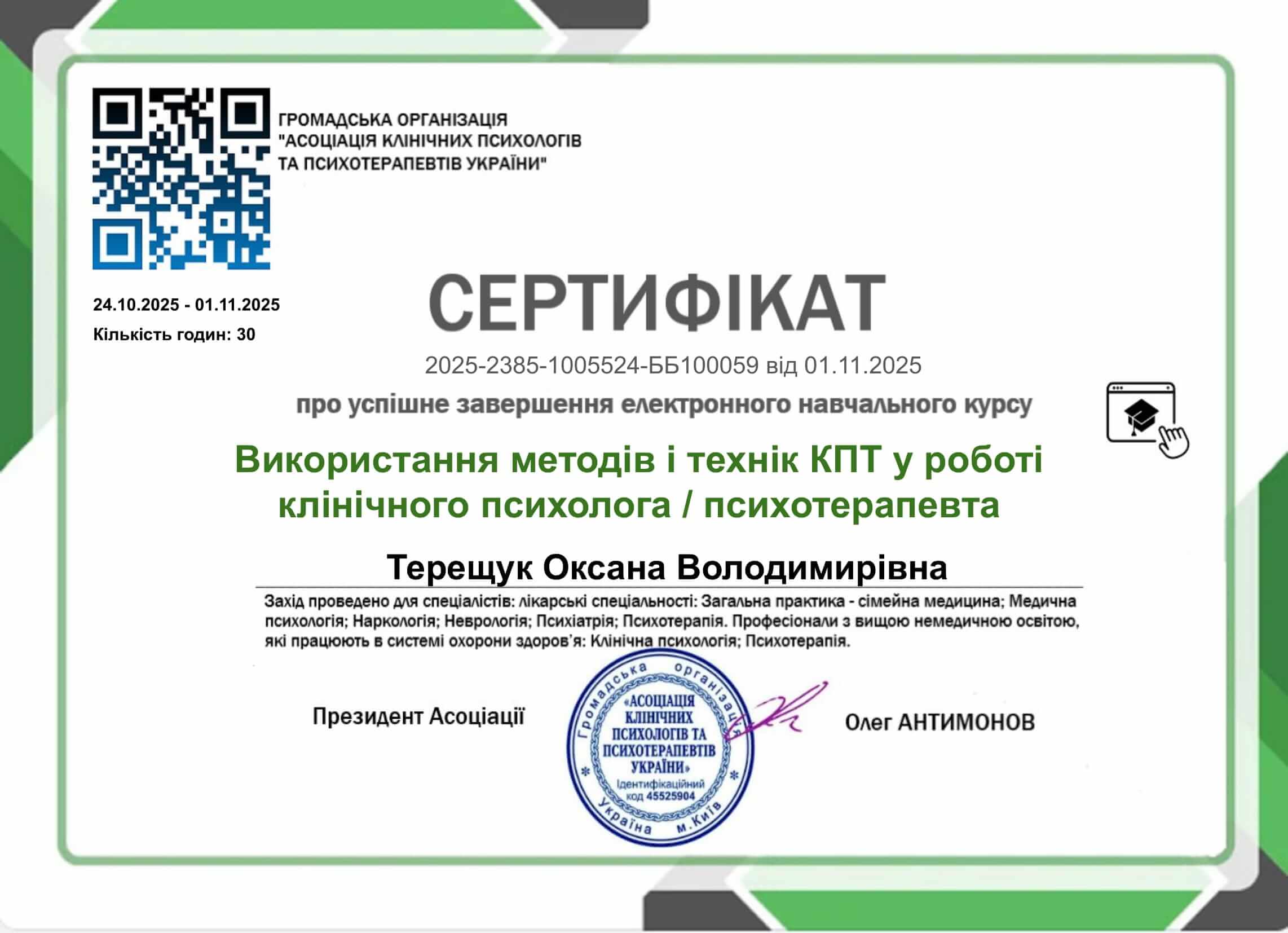- 2025 р. курс “Використання технік і методів КПТ у роботі клінічного психолога/психотерапевта”;