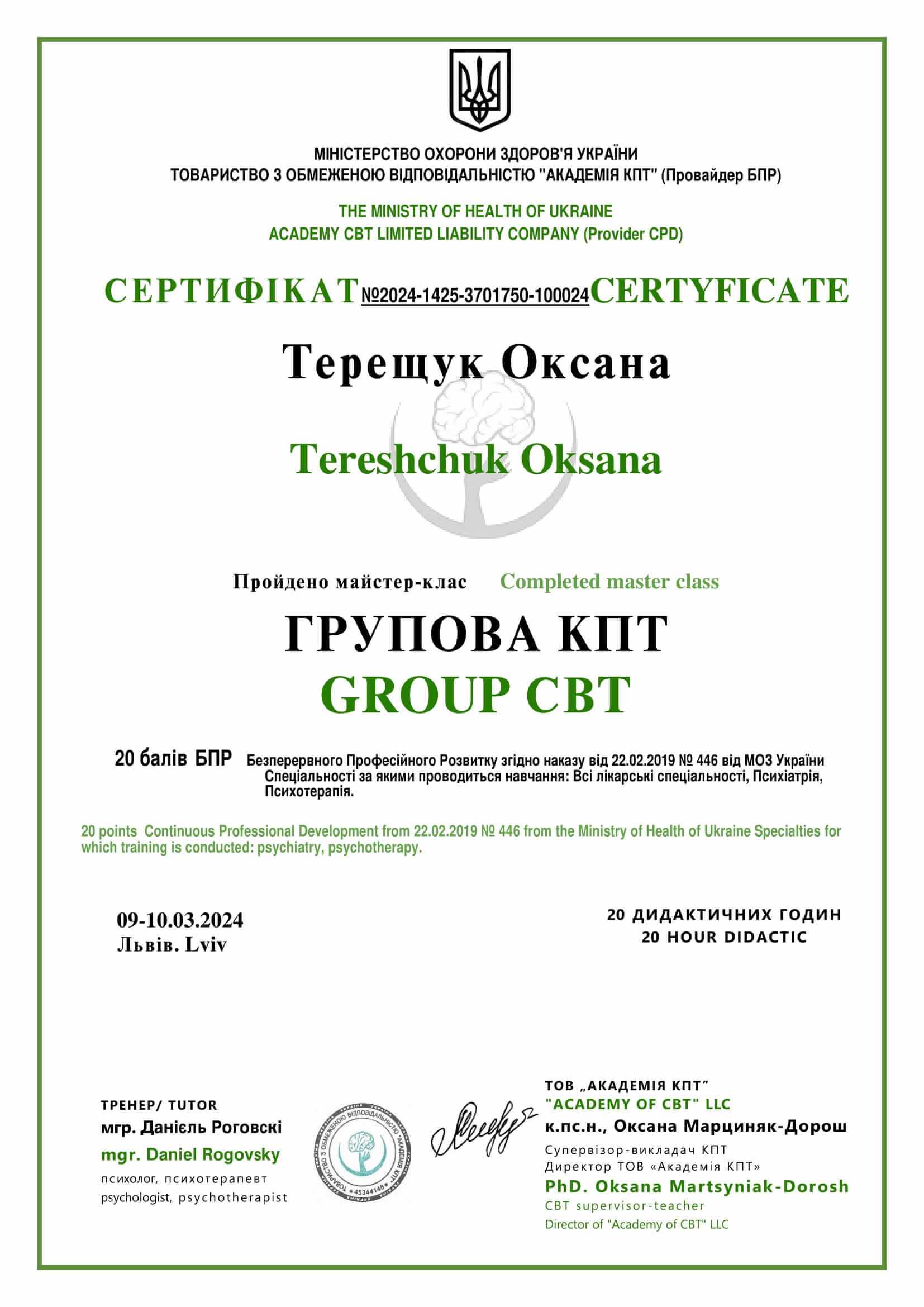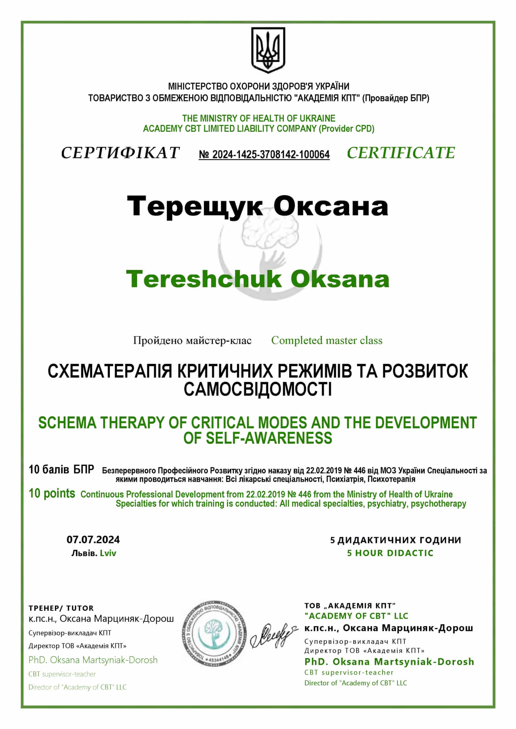- 2023-2025 рр. відвідую майстер класи по КПТ схема терапії в академії О.Марциняк-Дорош. ТОВ «Академія КПТ» провайдер БПР;
