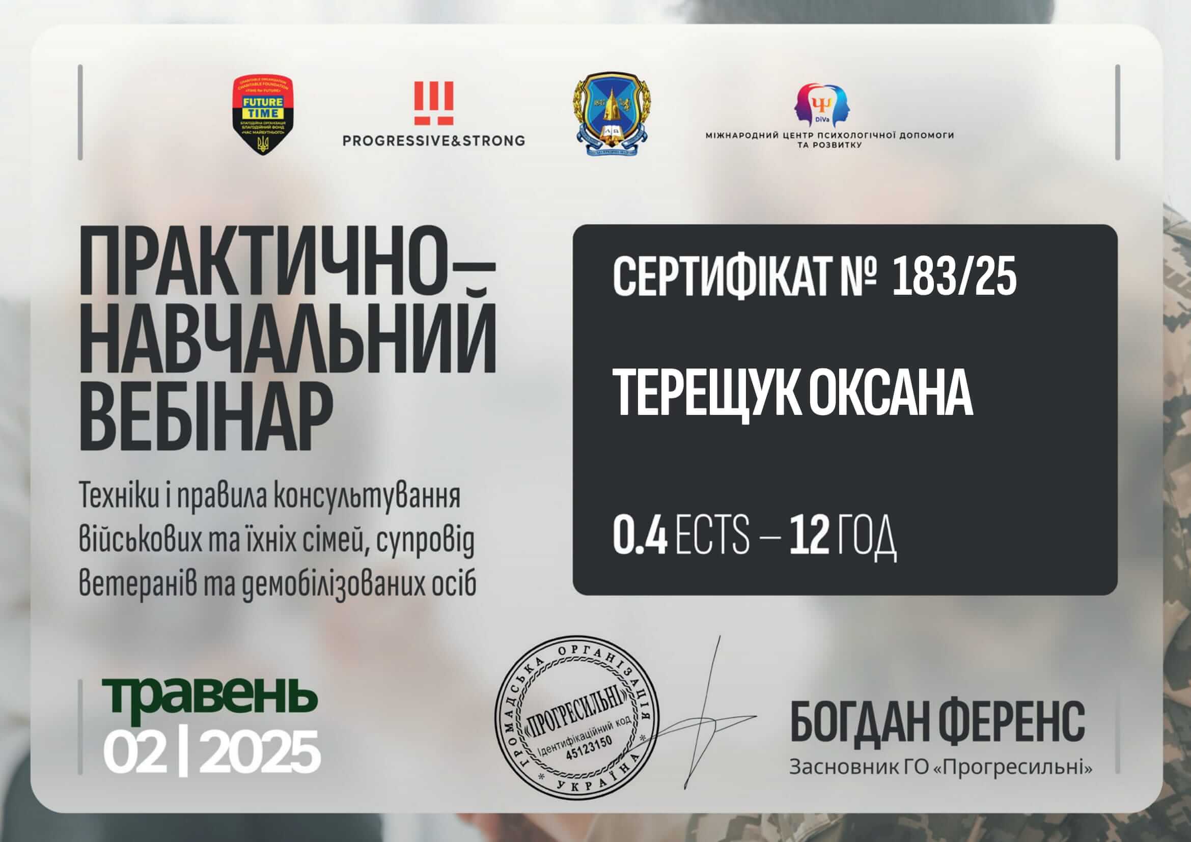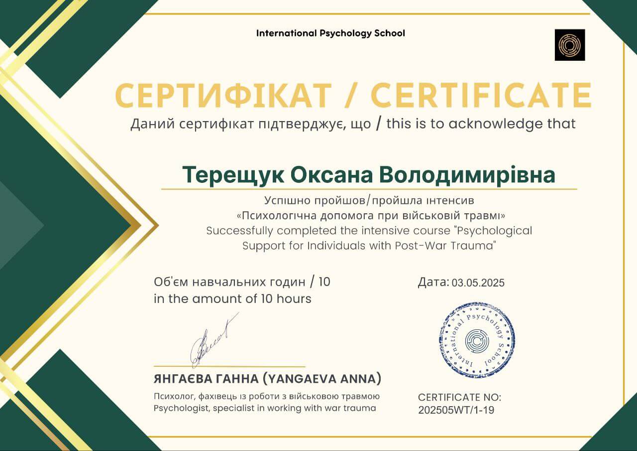 - 2025 р інтенсив «Психологічна допомога при військовій травмі» (10 год.);
