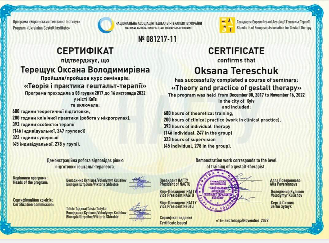 - Сертифікована – гештальт терапевт у листопаді 2022 року;