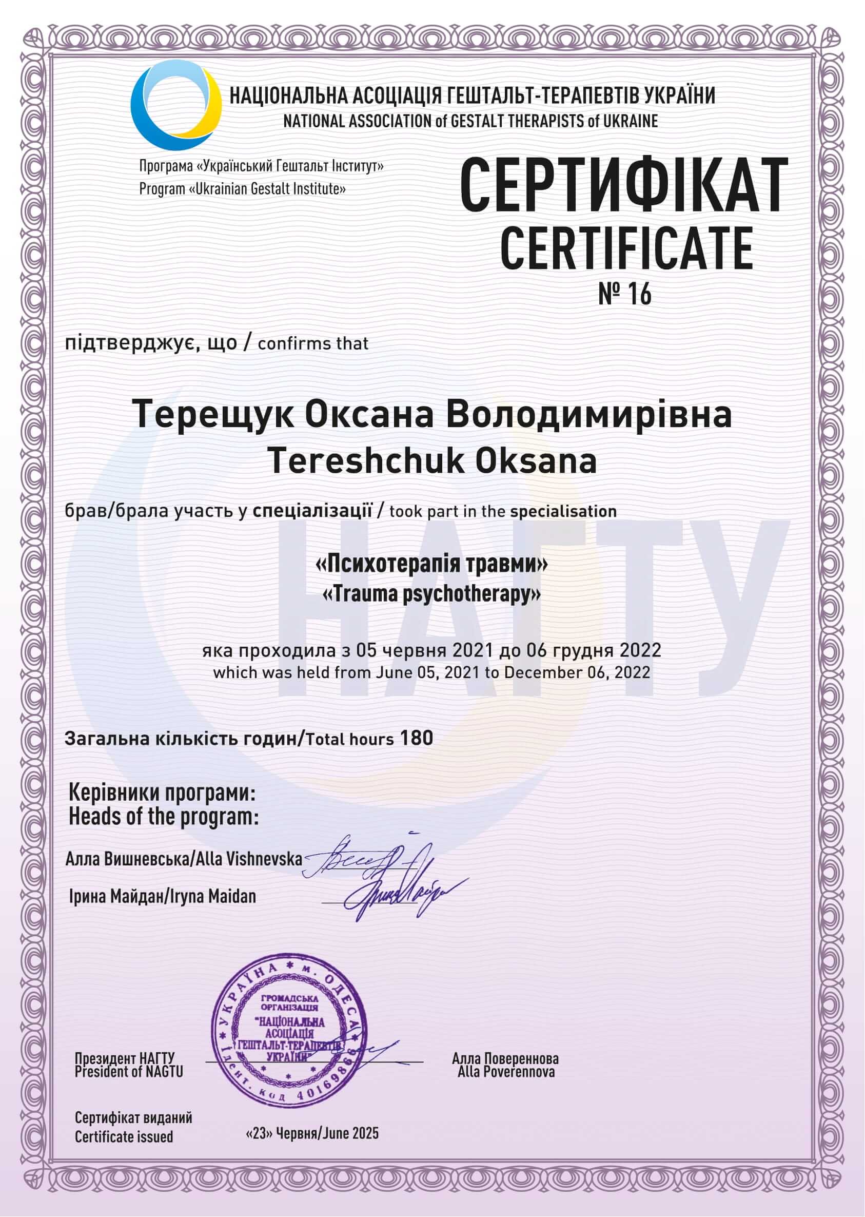- 2021-2022 рр спеціалізація « Психотерапія травми» (180 годин);