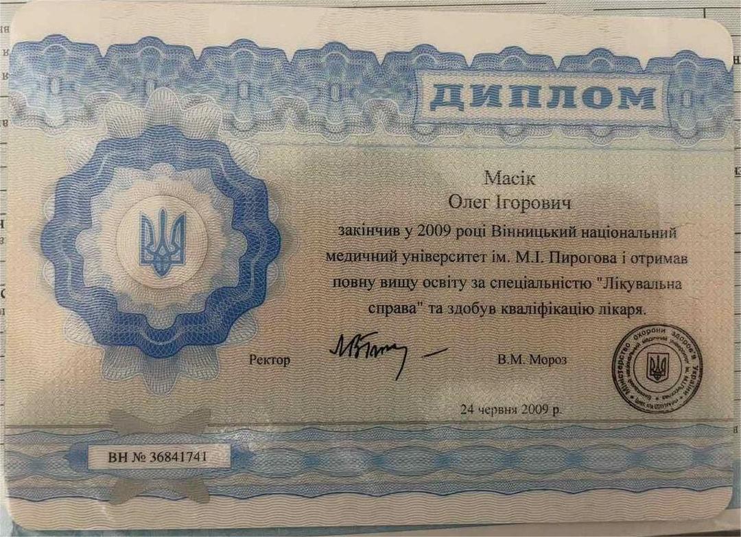 2009 — Диплом лікаря (спеціальність «Лікувальна справа»), Вінницький національний медичний університет ім. М. І. Пирогова