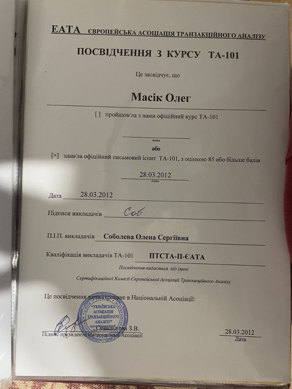 2012 — Курс ТА-101 (вступний курс транзакційного аналізу), Європейська асоціація транзакційного аналізу (EATA)