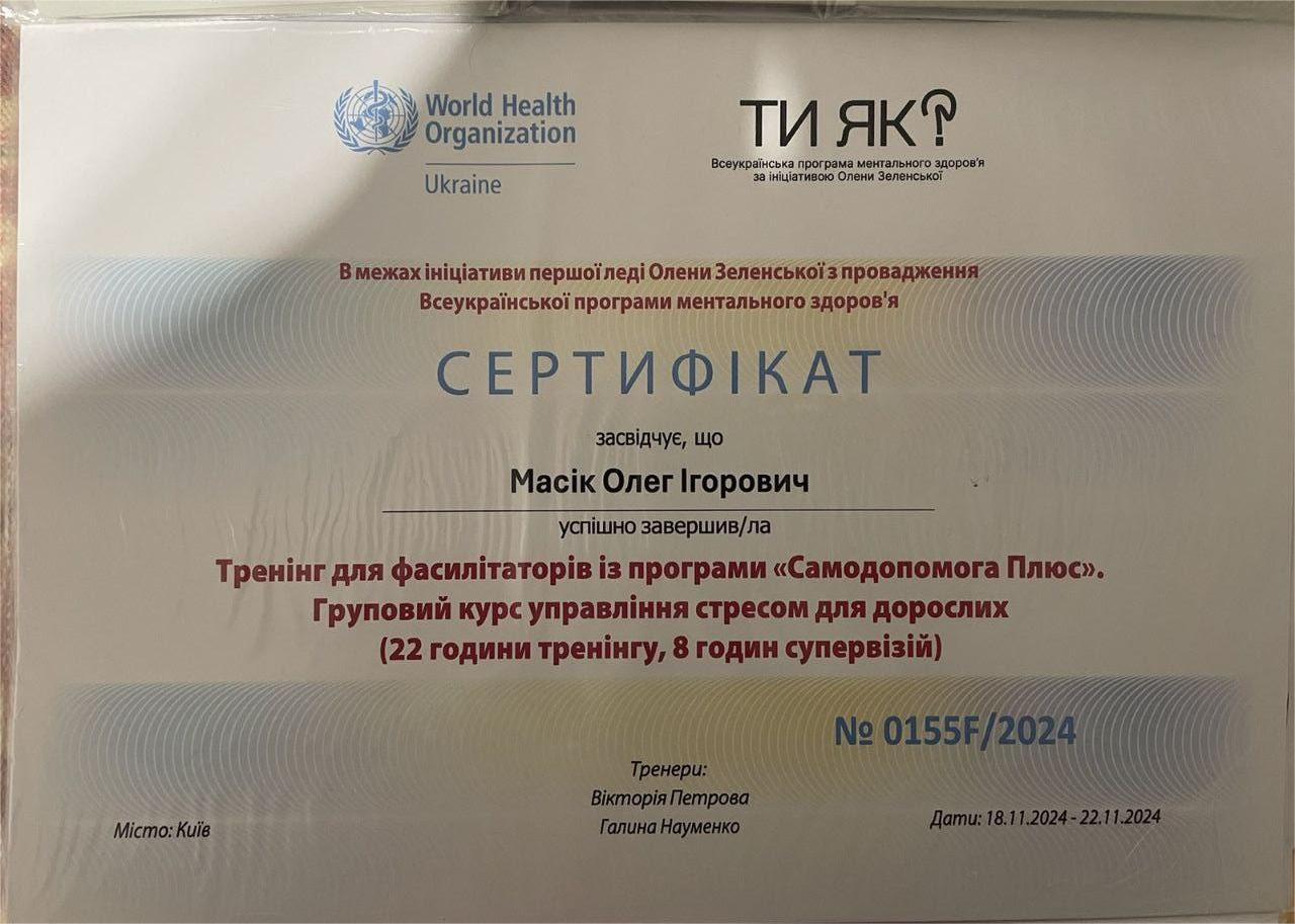 2024 — Тренінг для фасилітаторів програми «Самодопомога Плюс». Груповий курс управління стресом для дорослих Всеукраїнська програма ментального здоров’я «Ти як?» (ініціатива Олени Зеленської), World Health Organization Ukraine