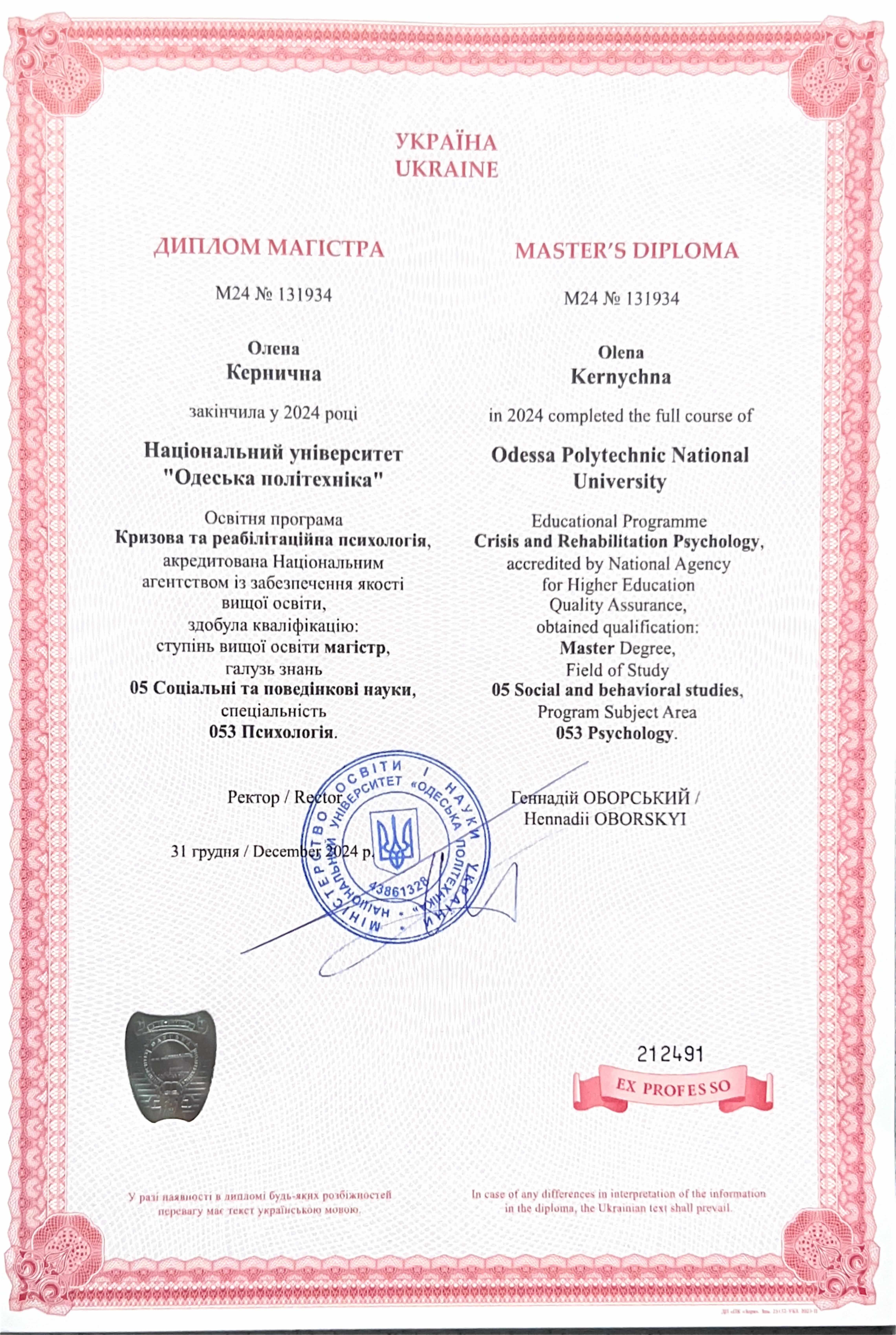 2023-2024рр. – НУОП – магістр «Кризова та реабілітаційна психологія»